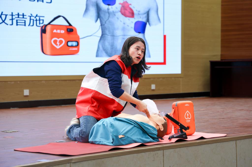 董超讲解了心肺复苏(CPR)、AED(自动体外除颤器)操作方法及海姆立克急救法等知识,并详细演示了心肺复苏的操作步骤,使参训师生了解掌握了基本急救技能。