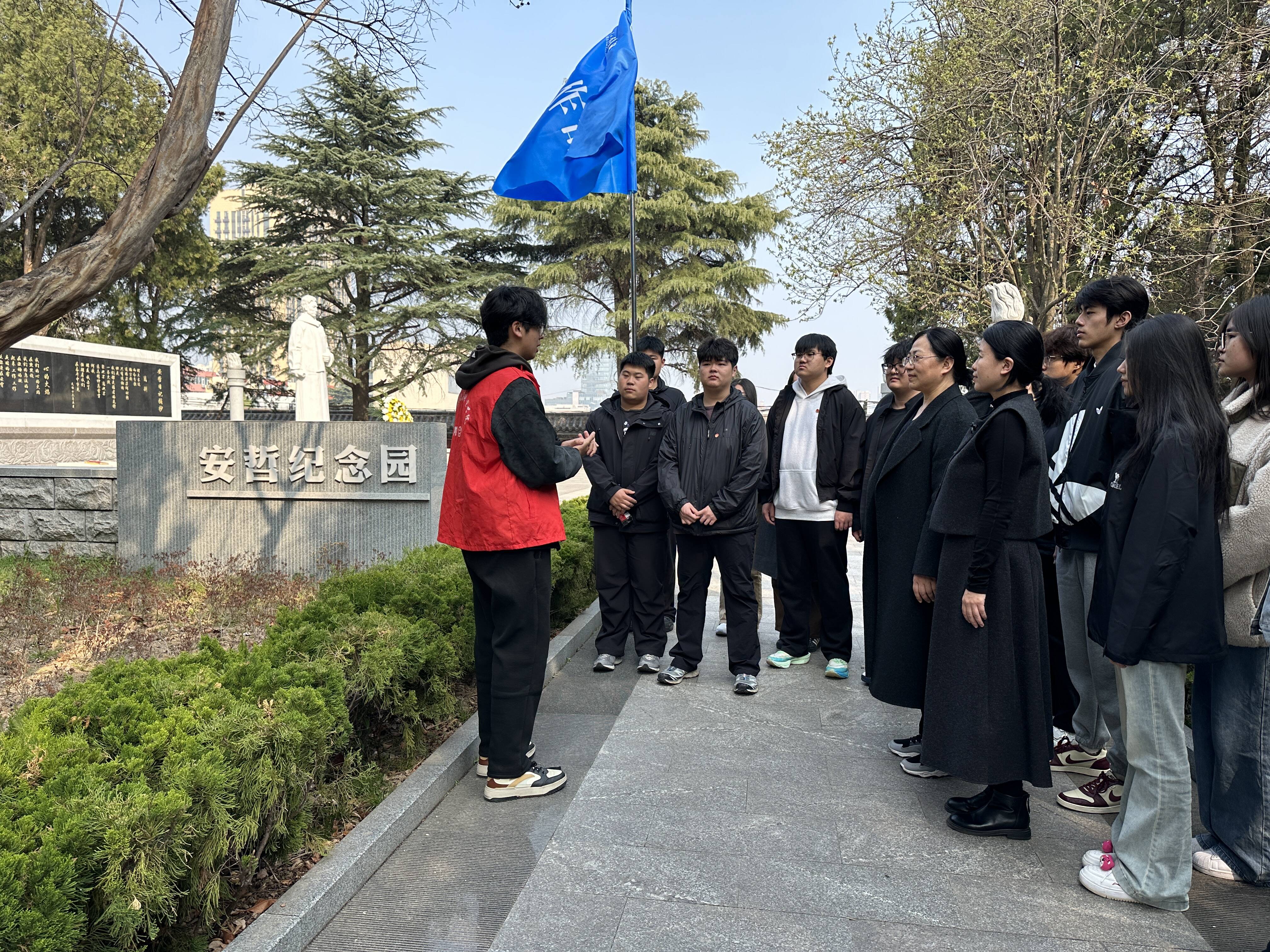 在安哲纪念园的苍松翠柏间,国合匠心红色文化宣讲团成员孔孟飞,面向同学们深情讲述革命先驱安哲的抗日英雄事迹。从组织发动日照暴动、秘密开展地下抗日斗争,到始终坚守革命信仰、不惧艰险英勇献身,一段段鲜活的过往、一个个感人至深的细节,徐徐铺展在大家眼前,让安哲烈士的爱国形象愈发立体鲜活。同学们静静聆听、深深感悟,在先辈的家国大义与坚定信念中接受精神洗礼,让红色基因融入血脉,让英烈精神真正入脑入心、代代相传。