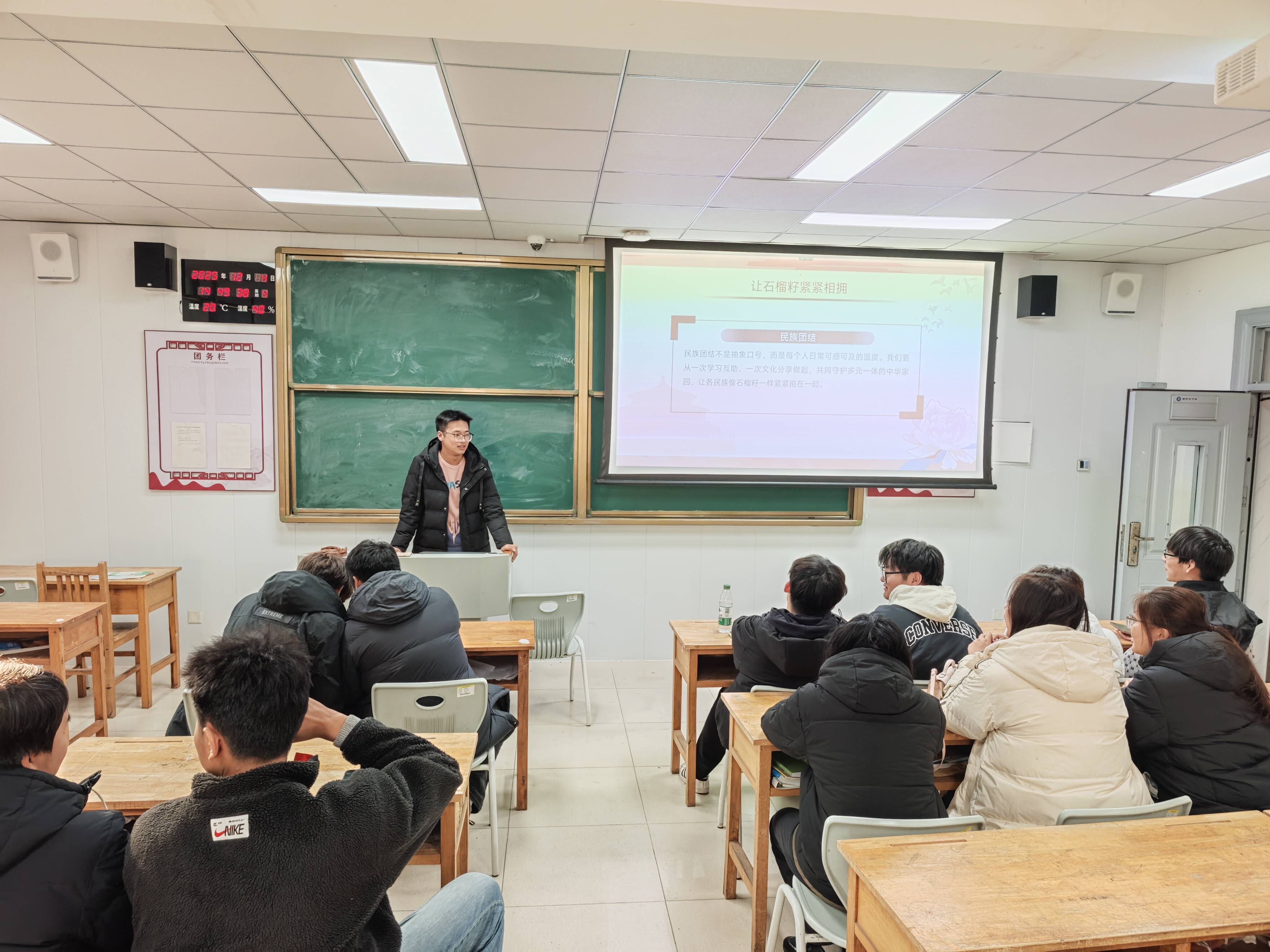 “中华民族一家亲,同心共筑中国梦”,各班级团支部在各自教室同步召开主题团日活动,开展“重要讲话领学”“民族团结故事分享”“青年使命大讨论”等内容。全体团员深入领会“各民族像石榴籽一样紧紧抱在一起”的生动寓意,进一步深化“感党恩、听党话、跟党走”的思想认同和行动自觉。