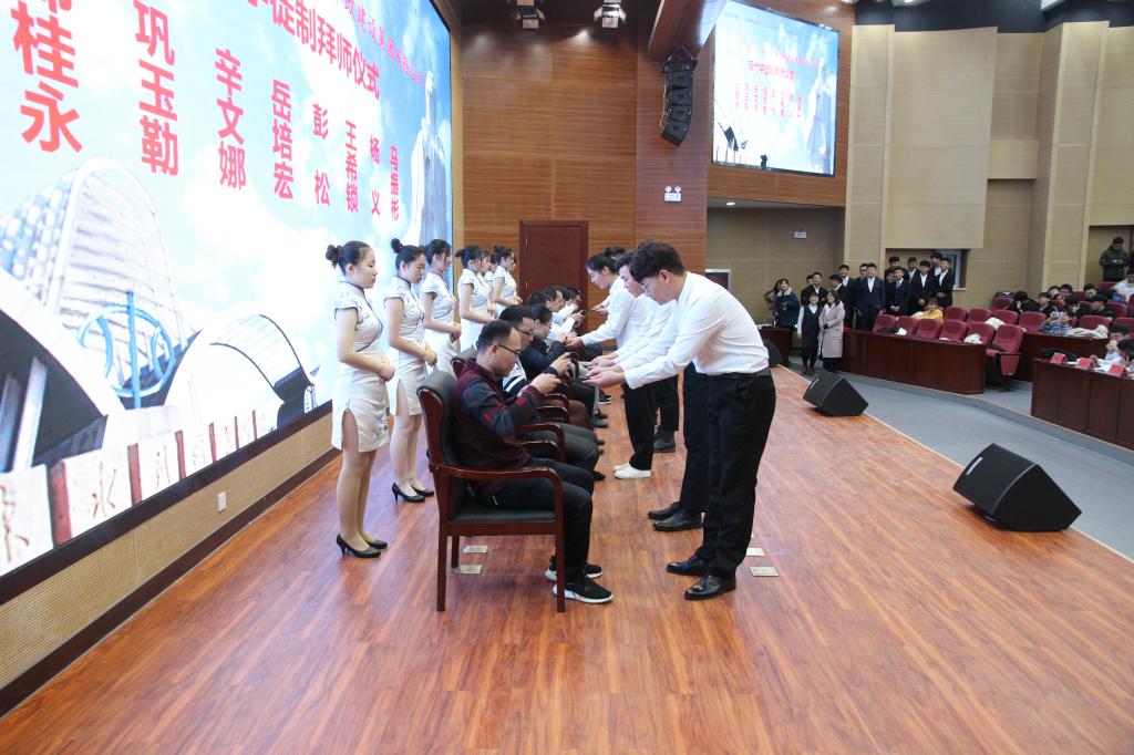 活动现场,69名现代学徒制班学生与中国电建市政建设集团有限公司的15名师傅进行了师徒结对,徒弟们分别向师傅行拜师礼、敬师傅茶。拜师礼成后,师徒代表分别作了表态发言。本次拜师仪式是现代学徒制试点的重要环节,通过拜师仪式明确师徒关系、双方职责,为今后开展人才精准培养打下良好基础。