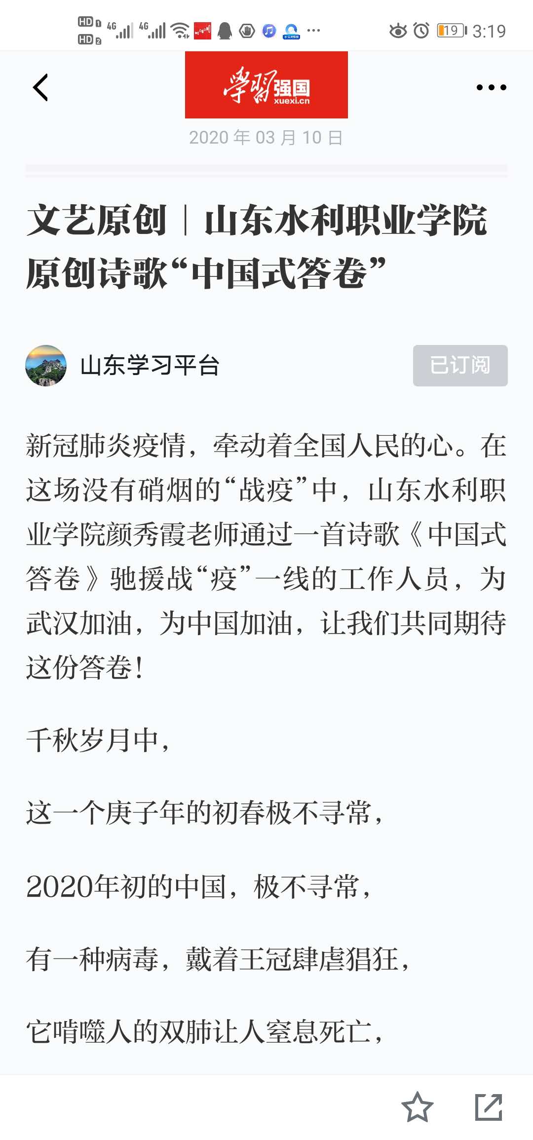 “寒冬已过,又是满目春光;曙光已现,胜利在望;中国式答卷,为世界防疫提供了大纲;中国式答卷,由人民评判,让历史珍藏!”近期,由我校教师颜秀霞创作的诗歌《中国式答卷》在网上发布后被广为传播,短短数小时点击量破万。网上走红的同时被学习强国山东学习平台选用。
