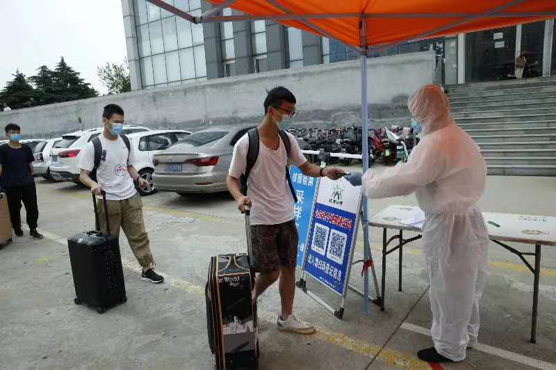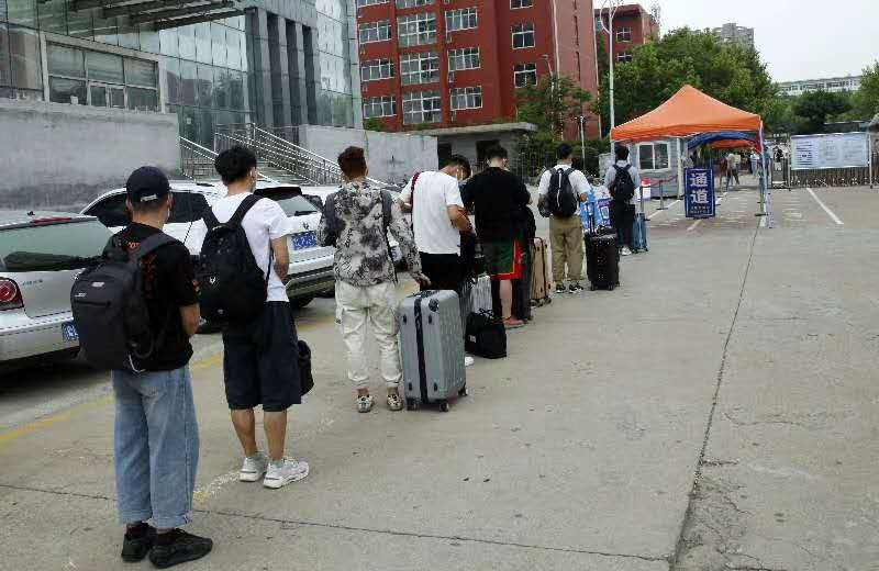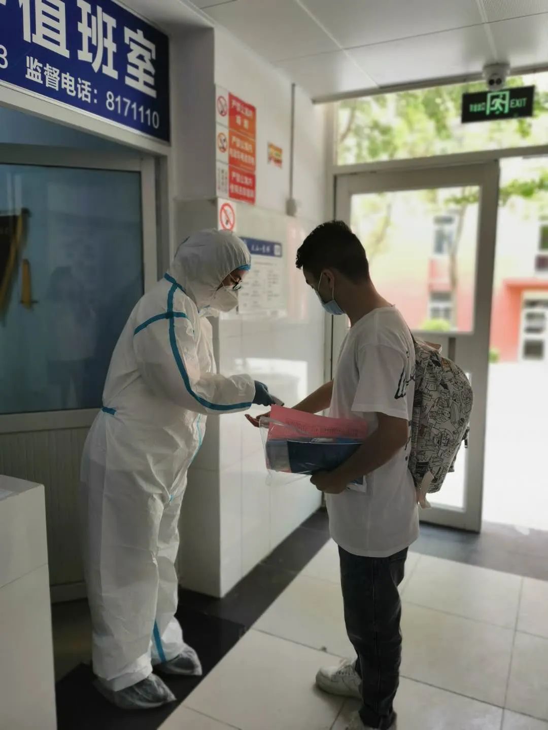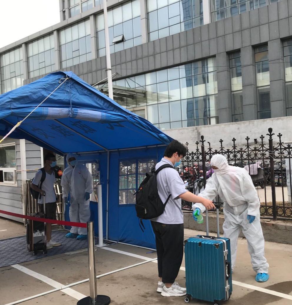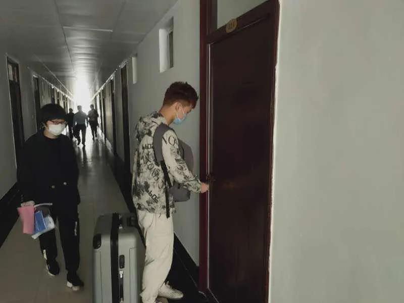 为保证报到现场安全、顺畅、有序,我校在德胜园公寓北门设置了返校学生入园固定通道。返校学生在老师的引导下,按照入园流程,依次核验山东电子健康通行码、检测体温、手部消毒、行李消毒,间隔1.5米有序等待入园。各系辅导员在接待点为学生发放《学生返校复学疫情防控工作指南》、口罩及温度计等健康礼包。体温正常的学生入园后立即进行核酸检测,学生填写错峰返校健康卡、签订承诺书后,由专人带领进入宿舍楼。在核酸检测结果未出来之前,学生不得出宿舍门,用餐由专人配送,确保返校过程形成严格的闭环。