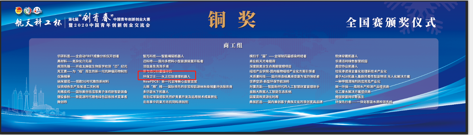 “环保卫士——水上垃圾清理机器人”项目通过社会渠道报名商工组创新组,在山东省团委组织的专家评审中脱颖而出,推荐参加全国赛。全国赛分为初赛、半决赛和决赛。进入初赛的商工组创新组项目全国共计140个,经过项目资料审核和紧张激烈的初赛项目评审,28个项目进入半决赛,最终获得全国赛铜奖。