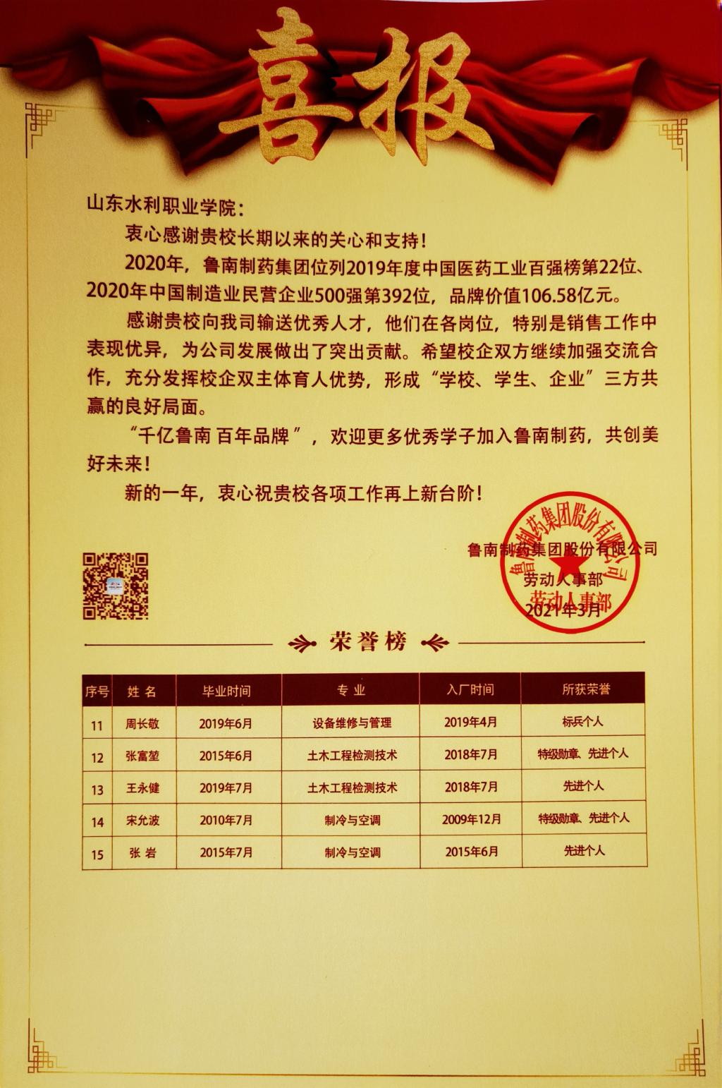 近日,我校收到鲁南制药集团股份有限公司发来的喜报,我校在该公司工作的15名毕业生,因在各自工作岗位上表现优异,为公司发展做出了突出贡献,受到公司表彰。其中2人获特级勋章、先进个人,1人获一级勋章、先进个人,1人获标兵个人,11人获先进个人。