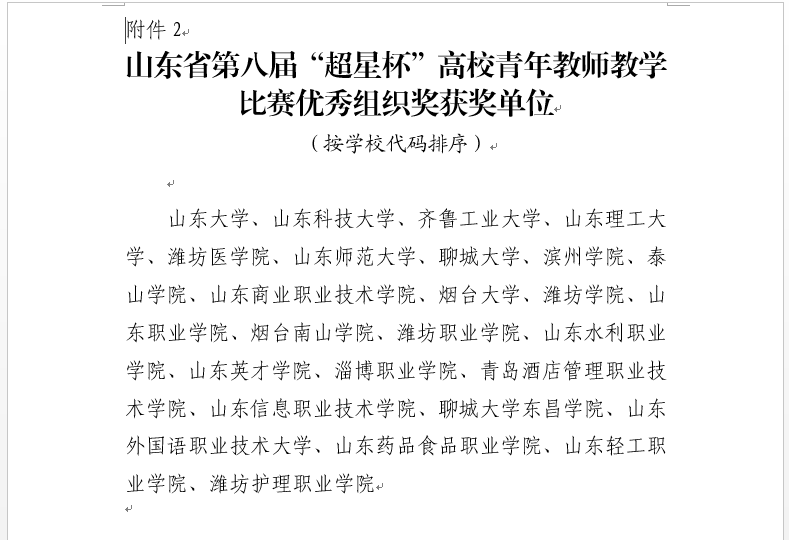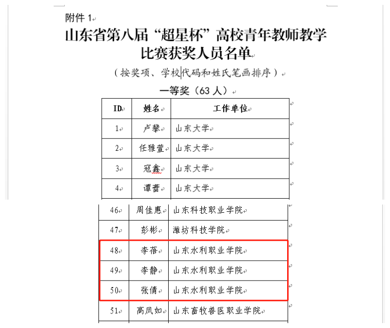 5月30日,由山东省教育厅、中国教育工会山东省委员会联合主办的第八届“超星杯”山东省高校青年教师教学比赛决赛圆满落幕。我校进入决赛的水利工程系李蓓、李静和经济管理系张倩三位青年教师荣获一等奖;机电工程系教师孟祥天获优秀奖。我校获优秀组织奖。