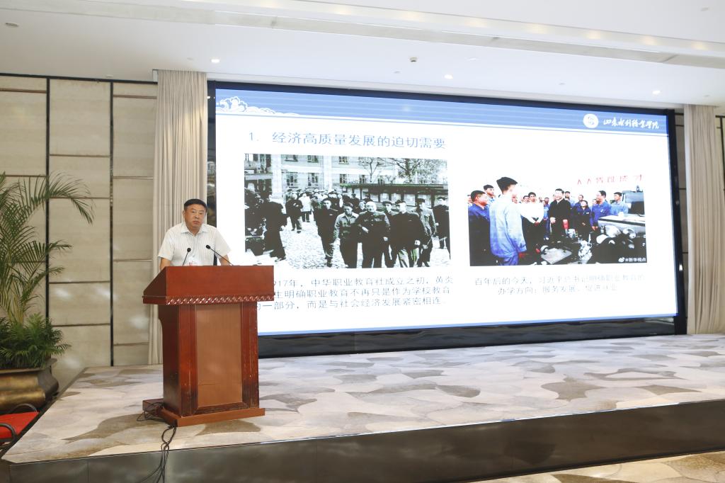 受大会邀请,于纪玉作了题为《新时代职业教育创新发展的山水探索与实践》的专题报告,从“大职教”与“乐业观”两个维度深刻阐述了黄炎培职业教育思想的核心内涵与当代启示,分享了我校多年来在职业教育事业发展方面的探索与实践。报告中,于纪玉结合我校创新创业教育开展情况,详细论述了“职教双创”对于推动职业教育事业发展的重大意义。在黄炎培职业教育思想研究会学术年会这一职教界盛会上,我校首次正式提出“职教双创”理念。独具职教本色与水院特色的“山水双创”育人模式受到与会代表的广泛认可与一致好评。