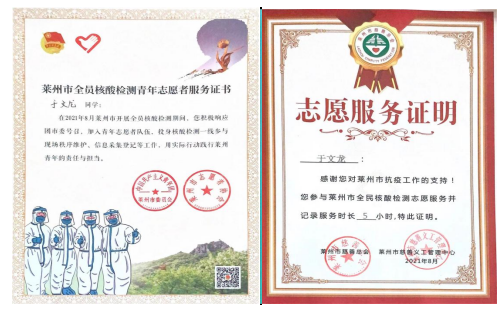 志愿服务结束后,于文龙同学心有感悟:“通过这次志愿服务,让我体会到了帮助他人的乐趣,也使我更加坚信,我们众志成城,万众一心,一定能战胜疫情,回归到原来平静美好的生活。”