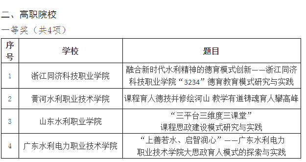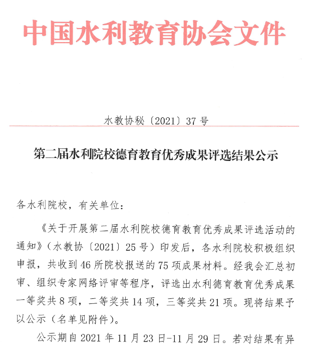 12月1日,中国水利教育学会发布《关于开展第二届水利院校德育教育优秀成果评选活动的通知》(水教协〔2021〕25号),经初审、专家网络评审等环节,我校课程思政建设成果《“三平台三维度三课堂”课程思政建设模式研究与实践》获一等奖。