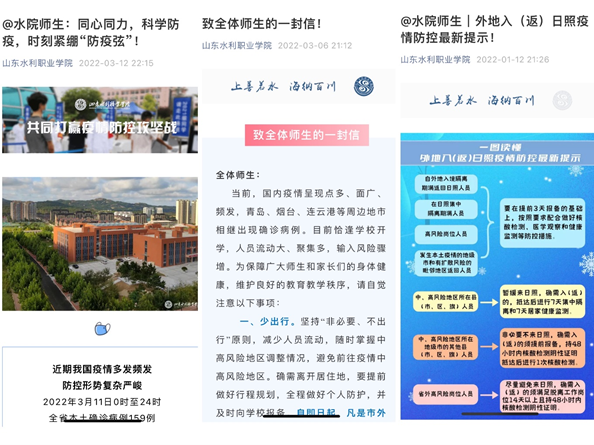 网络宣传,凝聚疫情防控正能量。学校利用“三微一端”及时推送防疫相关政策、有关规定和防疫知识,保证全校师生及时准确地了解、遵守有关防疫政策。加强网评员队伍建设,积极引导舆论导向,平稳度过重要节点。