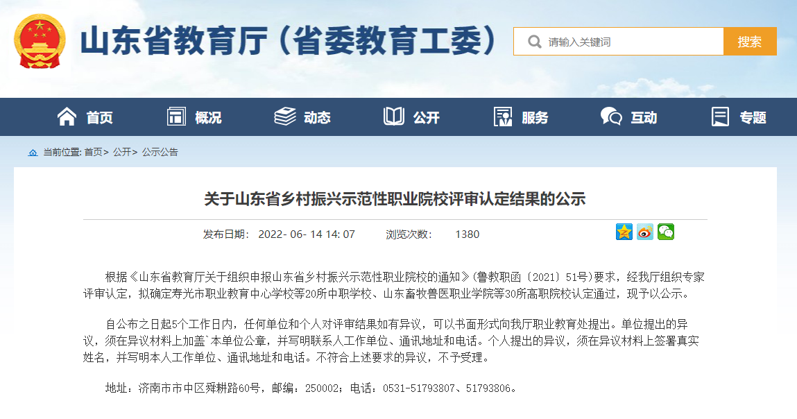 近日,山东省教育厅公示了山东省乡村振兴示范性职业院校评选认定拟定通过名单,我校成功入选。全省共有20所中职学校、30所高职院校通过评审认定。