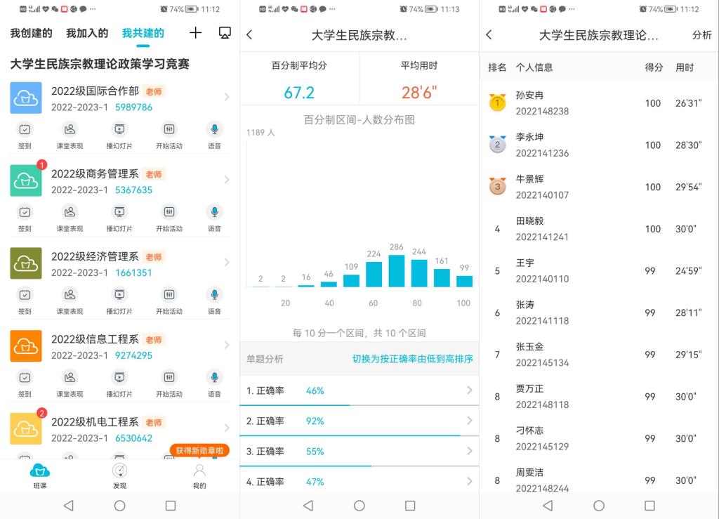 活动分为集中学习与网上答题两个阶段。学校高度重视此次学习竞赛活动,各党总支、直属党支部专人负责,广泛动员,精心组织。在为期两周的集中学习阶段,2022级5900余名学生登陆云班课参与学习。网上答题阶段,全校共有5640名学生参加答题,答题率为95.08%。比赛按照成绩高低和答题时长评选出个人优胜奖,对排名前100名的同学评选个人一二三等奖。