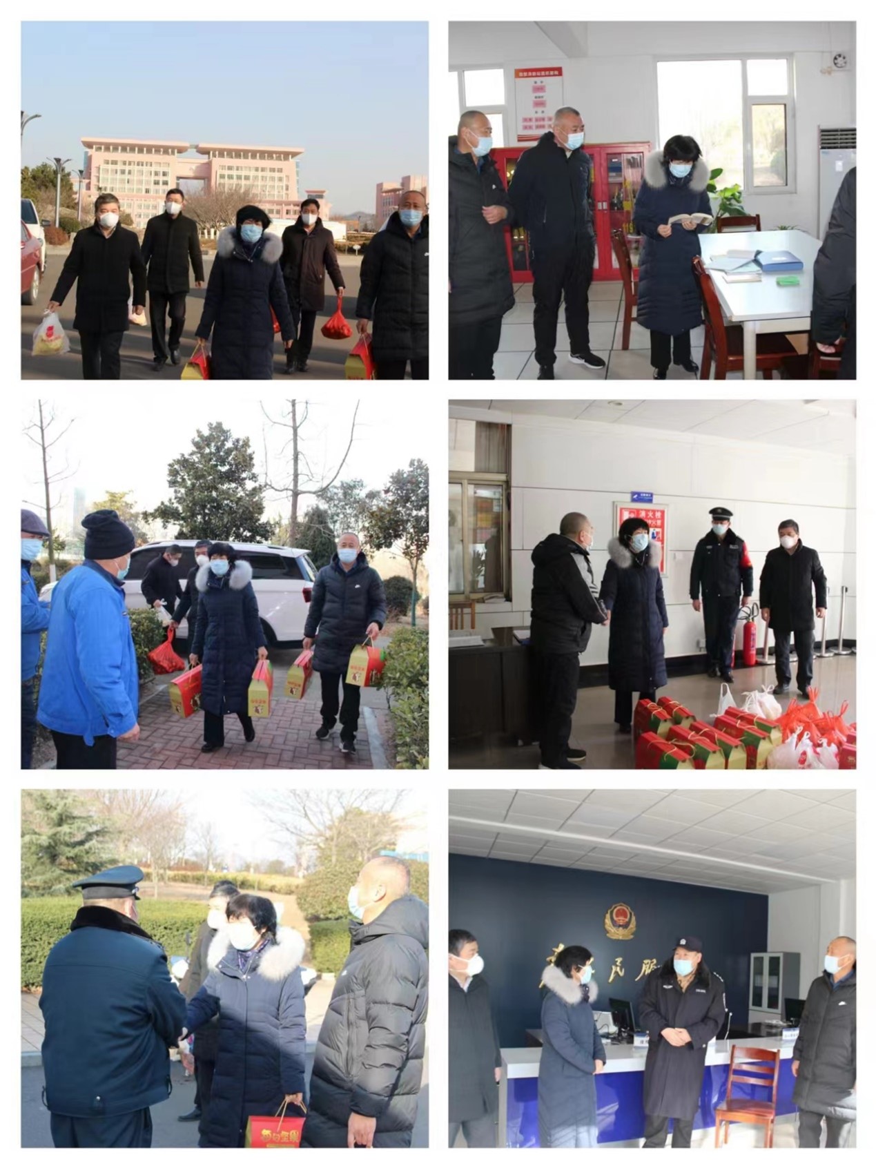 “今天是大年三十,给大家拜年了!大家辛苦了!”颜秀霞、刘秋生走访了学校门卫值班室、物业、配电室、消防控制室、基建值班室、警务室等岗位,校领导们与值班值守干部职工亲切交流,衷心感谢大家一年来为学校发展所付出的辛勤劳动和做出的贡献,向他们致以新春的美好祝愿和诚挚问候,并为他们送上了慰问品。