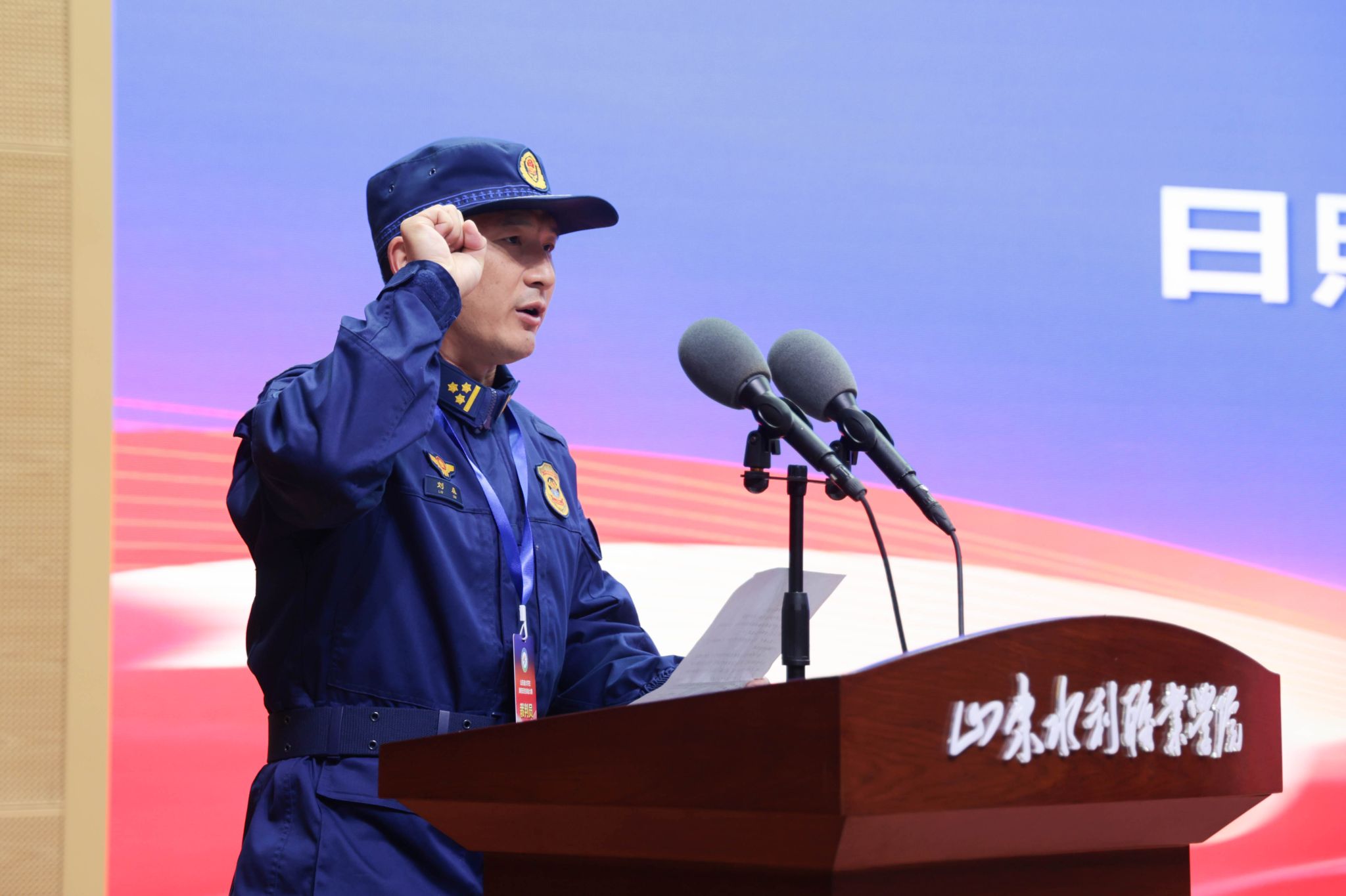 裁判代表、日照市东港区海曲路消防救援站政治指导员刘森宣誓。