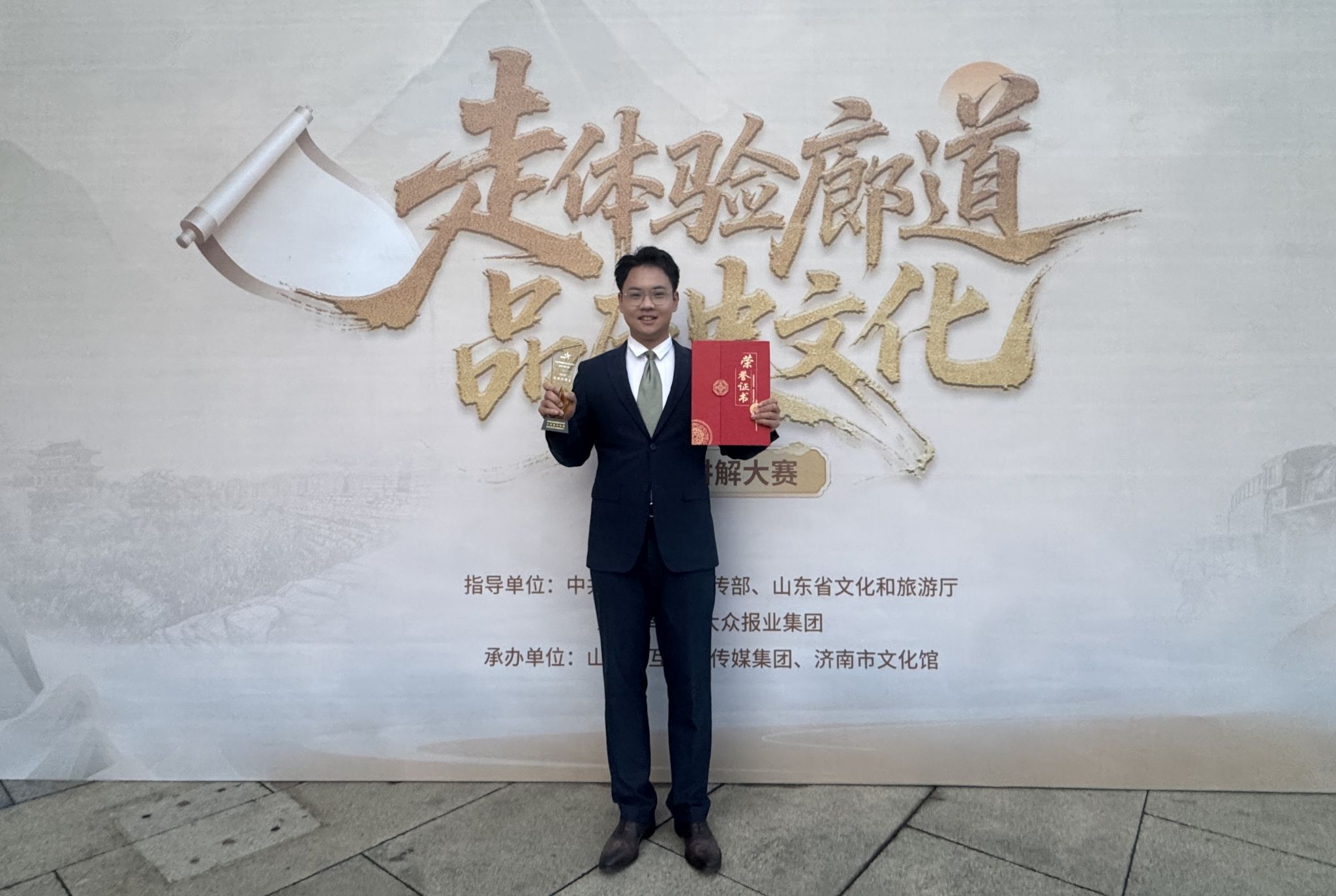 12月23日,由中共山东省委宣传部、山东省文化和旅游厅指导,大众报业集团主办,山东省互联网传媒集团承办的“走体验廊道 品历史文化”故事讲解大赛决赛圆满落幕。来自全省专业领域、高校学子及志愿群体的83名优秀选手同台竞技,深度诠释山东“四廊一线”文化体验廊道的历史底蕴与人文内涵。学院水利工程系吕伟嘉同学凭借深厚的文化积淀、精湛的讲解技艺与真挚的传播热情脱颖而出,荣获高校组“金牌讲解员”称号。