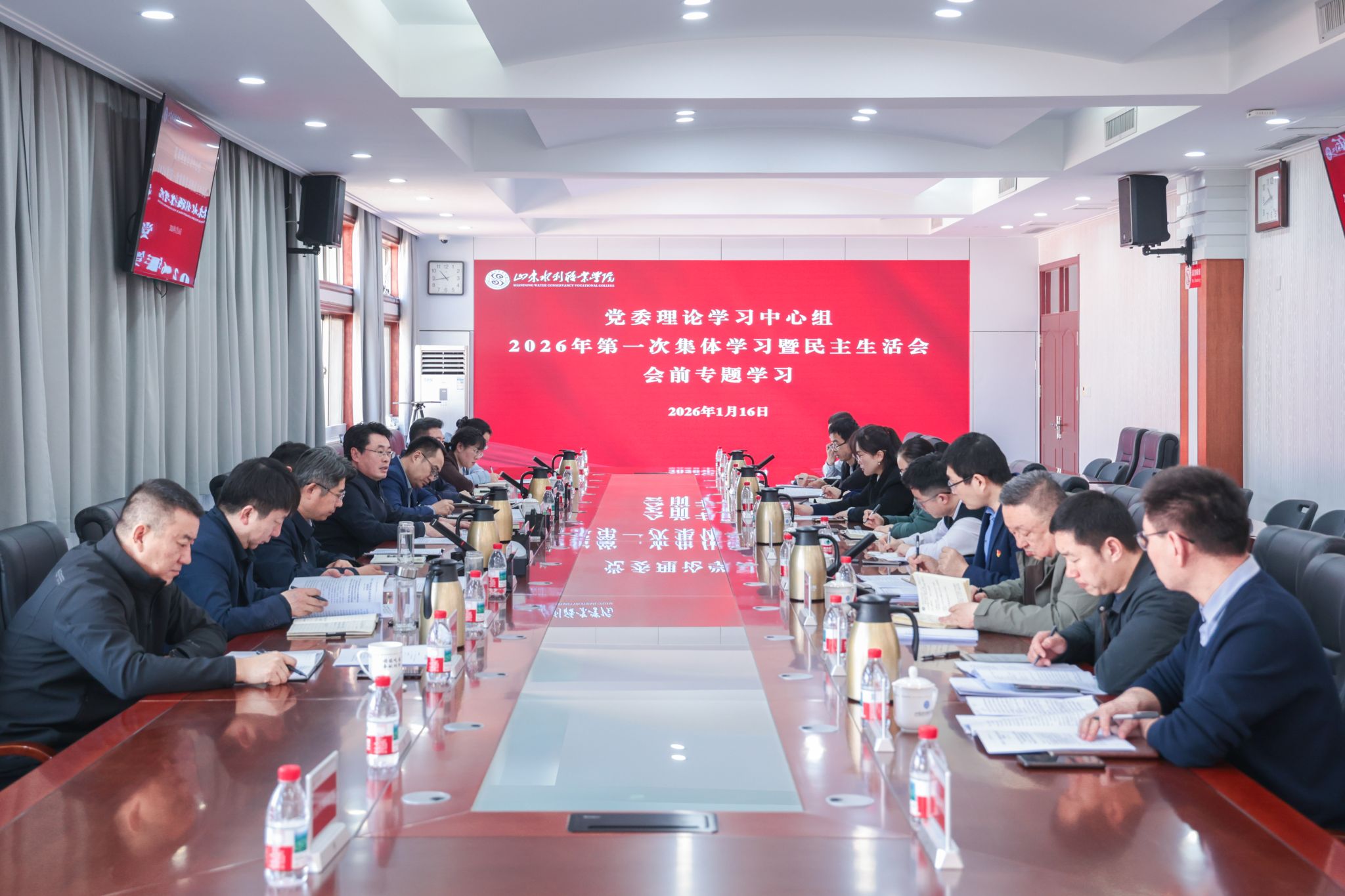 1月16日,学院党委理论学习中心组开展2026年第一次集体学习暨民主生活会会前专题学习,深入学习习近平总书记在中央政治局民主生活会上的重要讲话精神、在二十届中央纪委五次全会上的重要讲话精神以及《中国共产党思想政治工作条例》。党委书记王维主持集体学习并讲话。党委理论学习中心组成员、青年干部代表参加学习。