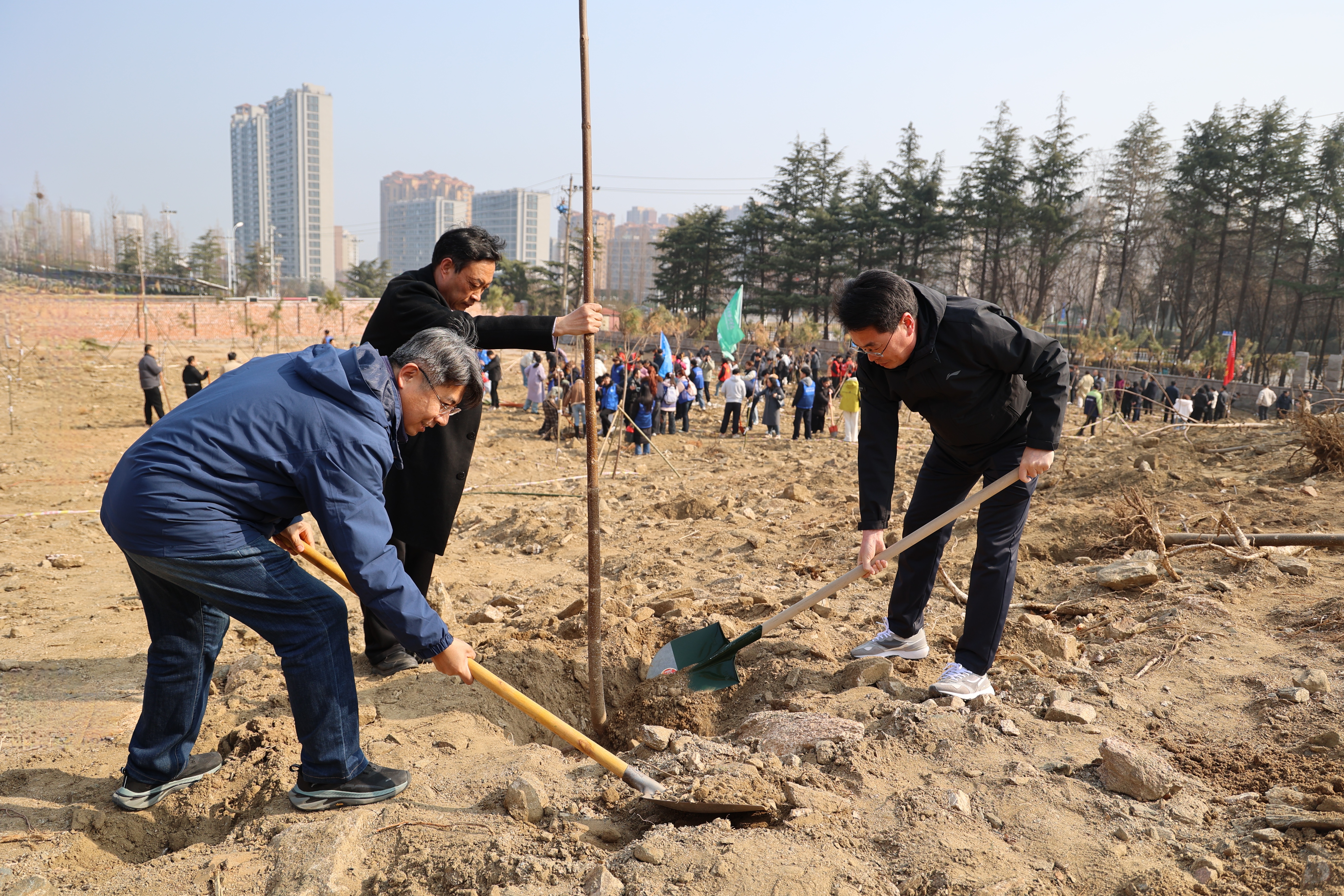 植树活动在校园东南角及太公湖北山顶同步展开。党委书记王维等学院领导与广大师生并肩投身劳动,大家分工协作、默契配合,挥锹铲土、扶苗填坑、培土浇水,呈现出一幅幅热火朝天的生动画卷。经过全体师生的共同奋战,此次活动共成功栽植连翘、梨树、枣树、杏树、桃树、西梅、苹果、梧桐等各类苗木400余株。一棵棵新苗迎风挺立,为春日的校园增添了一抹清新悦目的绿意。
