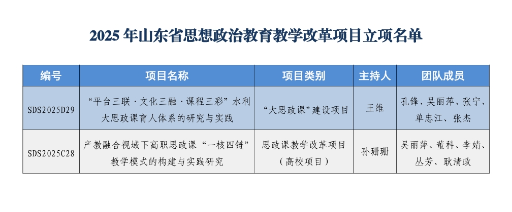 《“平台三联·文化三融·课程三彩”水利大思政课育人体系的研究与实践》入选“大思政课”建设项目。该项目立足水利行业特色,整合校内外优质平台资源,聚焦构建平台联动、文化融入、课程出彩的育人模式,推动思政教育与中华优秀传统文化、革命文化、水文化深度互融,打造具有水利行业辨识度的“红绿蓝”课程三彩品牌,探索形成可复制、可推广的水利大思政课育人体系。