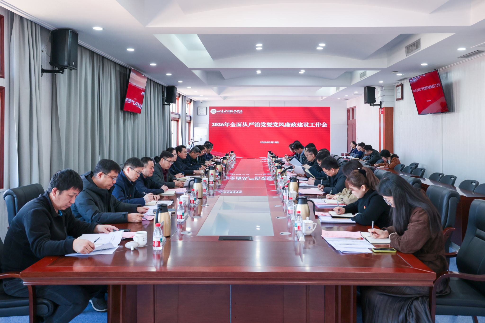 3月19日,学院召开全面从严治党暨党风廉政建设工作会议。会议传达学习了2026年全省水利系统全面从严治党暨党风廉政建设工作会议精神,布置安排2026年全面从严治党、党风廉政建设和反腐败工作。党委书记王维主持会议并讲话。学院领导班子成员,各部门、系部负责人参加会议。