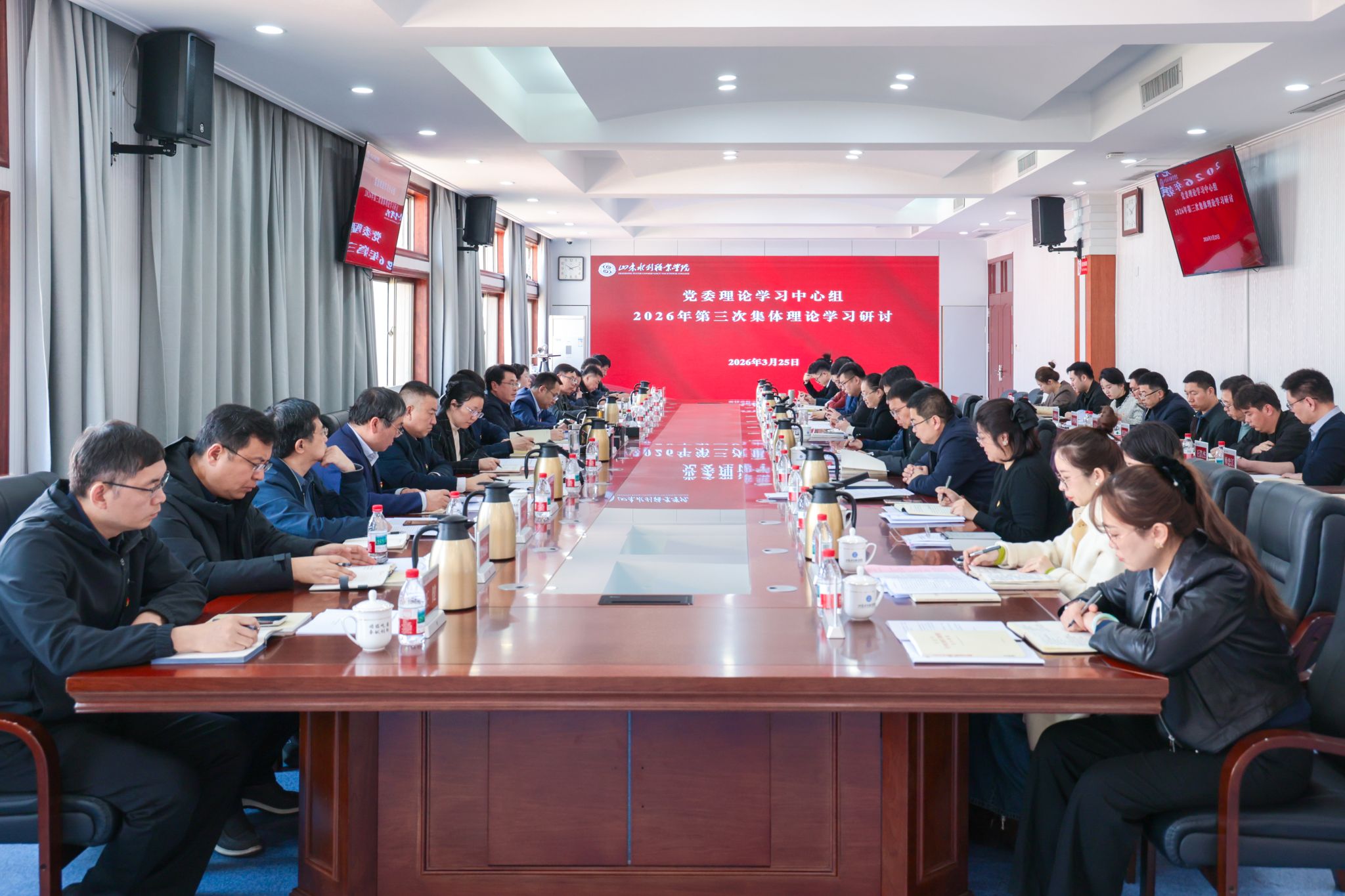 3月25日,学院党委理论学习中心组开展2026年第三次集体学习,围绕学习贯彻习近平文化思想和习近平总书记关于意识形态工作的重要论述,以及习近平总书记关于树立和践行正确政绩观的重要论述,联系实际进行学习交流研讨。党委书记王维主持集体学习并讲话。党委理论学习中心组成员,各党总支书记、部门主要负责人和青年干部代表参加学习。