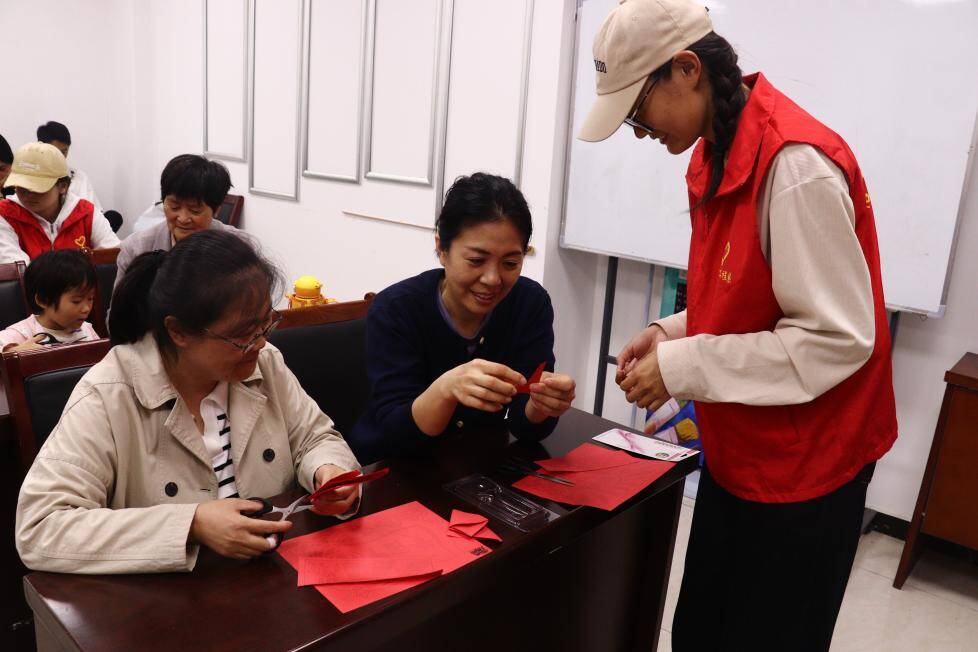 活动当天,社区党群服务中心内喜庆氛围浓厚。志愿者们提前准备好剪纸课件、示范作品及物料,既担任主讲人讲解剪纸艺术的历史渊源与文化内涵,又通过现场演示将复杂技艺拆解为易掌握的步骤,针对“五角星”“天安门”等国庆元素及“喜”“福”等吉祥图案,为社区群众提供一对一指导。在志愿者的带领下,大家纷纷手持红纸与剪刀沉浸创作,一幅幅栩栩如生的红色剪纸作品接连诞生,凝聚着对祖国繁荣昌盛的真挚祝福。现场欢声笑语不断,校社联动情谊在指尖流转中持续深化。