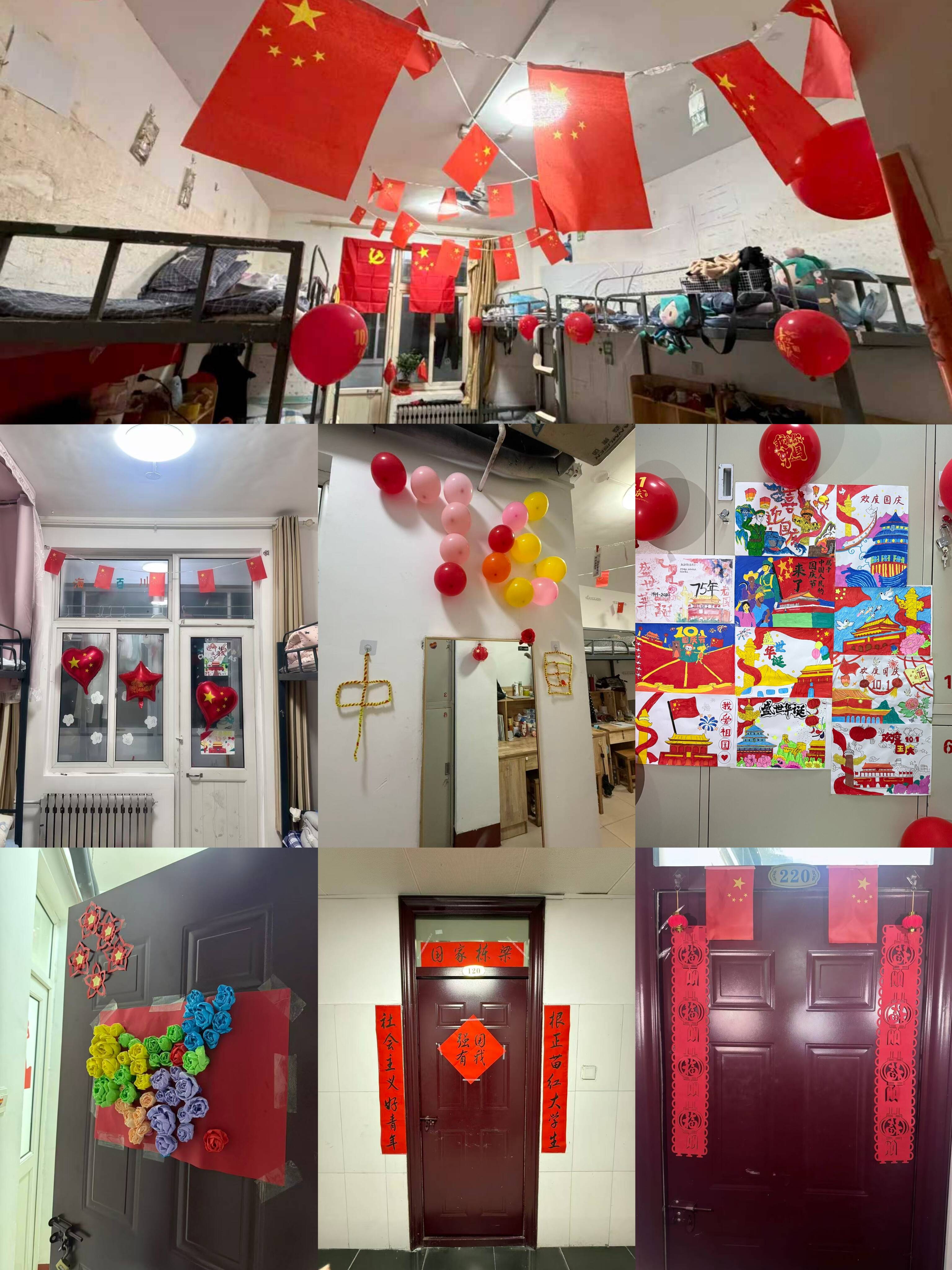 自活动启动以来,同学们热情高涨,充分发挥想象力与创造力,以宿舍为单位,紧密协作,精心策划装饰方案。大家巧妙运用国旗、中国结、灯笼、剪纸、彩带、气球等元素,并结合书法、绘画、手工艺品等多种形式,将原本普通的宿舍空间打造得新颖独特,处处洋溢着浓厚的节日氛围。有的宿舍在门窗上贴上了精美的爱国主题窗花和“祝福祖国”的标语;有的宿舍利用闲置物品进行环保创意设计,体现了绿色发展的理念;有的宿舍则通过悬挂同学们亲手书写的爱国诗词或励志格言,展现了深厚的文化底蕴和家国情怀。走廊、公共活动区域也在同学们的共同努力下装扮一新,成为了公寓楼内亮丽的风景线。同学们在协作中增进了友谊,在创作中表达了对祖国母亲最真挚的祝福。