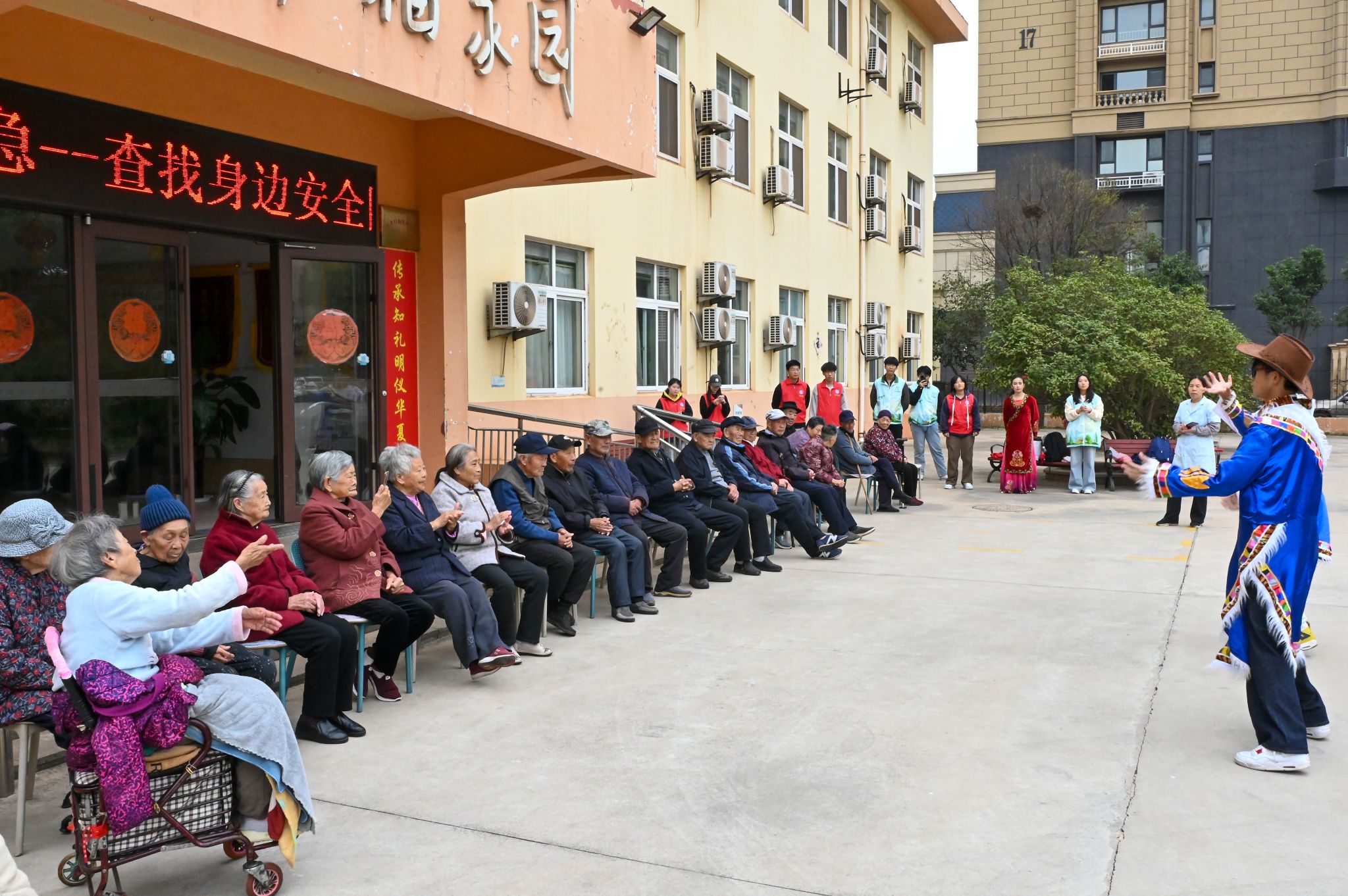 活动在热烈的氛围中拉开帷幕,机电学子们化身“文艺使者”,为老人们呈现了一场精彩纷呈的才艺盛宴。《夕阳红》《难忘今宵》等一首首经典老歌缓缓流淌,熟悉的旋律勾起了老人们的青春记忆,不少长辈跟着节奏轻轻哼唱,眼角眉梢满是怀念与笑意。擅长民族舞蹈的同学身着特色服饰,带来活力四射的藏族舞与新疆舞,灵动的舞姿、欢快的节奏将现场气氛推向高潮,老人们频频点头称赞,掌声与喝彩声此起彼伏,敬老院里洋溢着欢乐祥和的气息。
