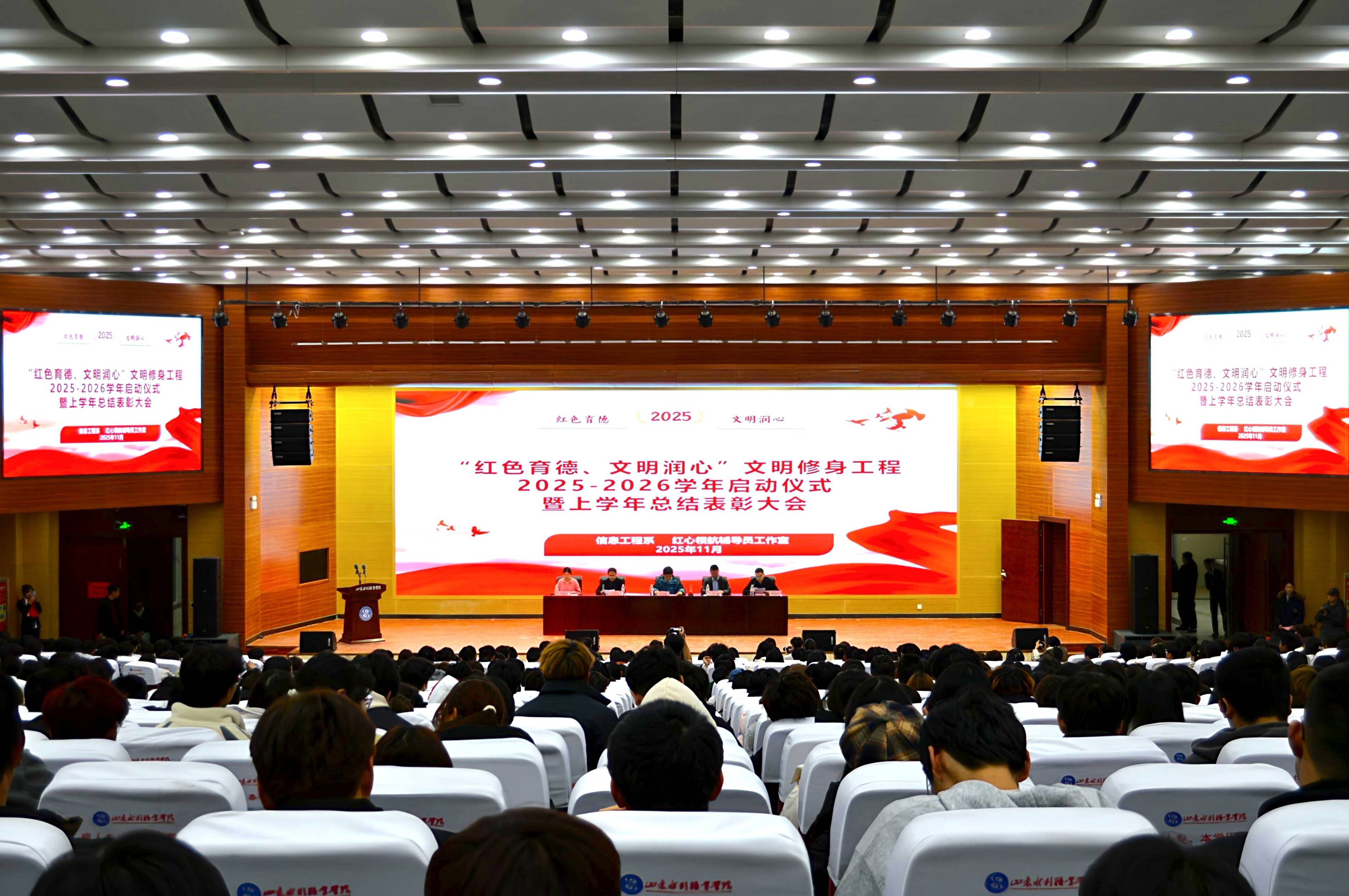 11月27日,信息工程系在学术会议中心举行2025-2026 学年“红色育德、文明润心”文明修身工程启动仪式暨2024-2025学年总结表彰大会。信息工程系党总支书记黄鲁新、系主任尹成,系全体学工人员及2024、2025级600余名学生代表参加活动。