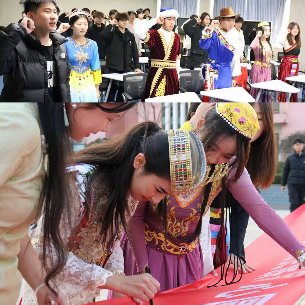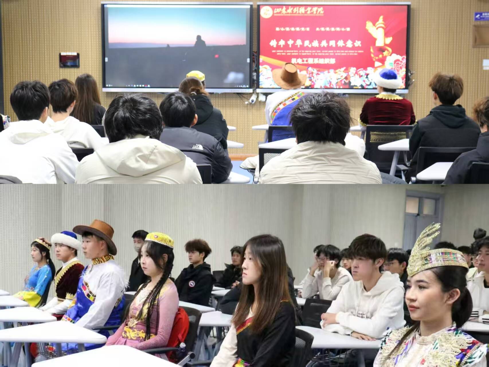 活动伊始,同学们共同观看主题视频。视频中既有民族团结模范的感人事迹、各民族共庆佳节的鲜活场景,也有脱贫攻坚路上的民族互助故事,直观展现了中华民族共同体建设的丰硕成果。大家从中领略各民族独特的习俗、语言与生活风貌,深刻体会 “五十六个民族要像石榴籽一样紧紧抱在一起” 的深刻内涵,进一步增强了对民族团结的认同感与使命感。