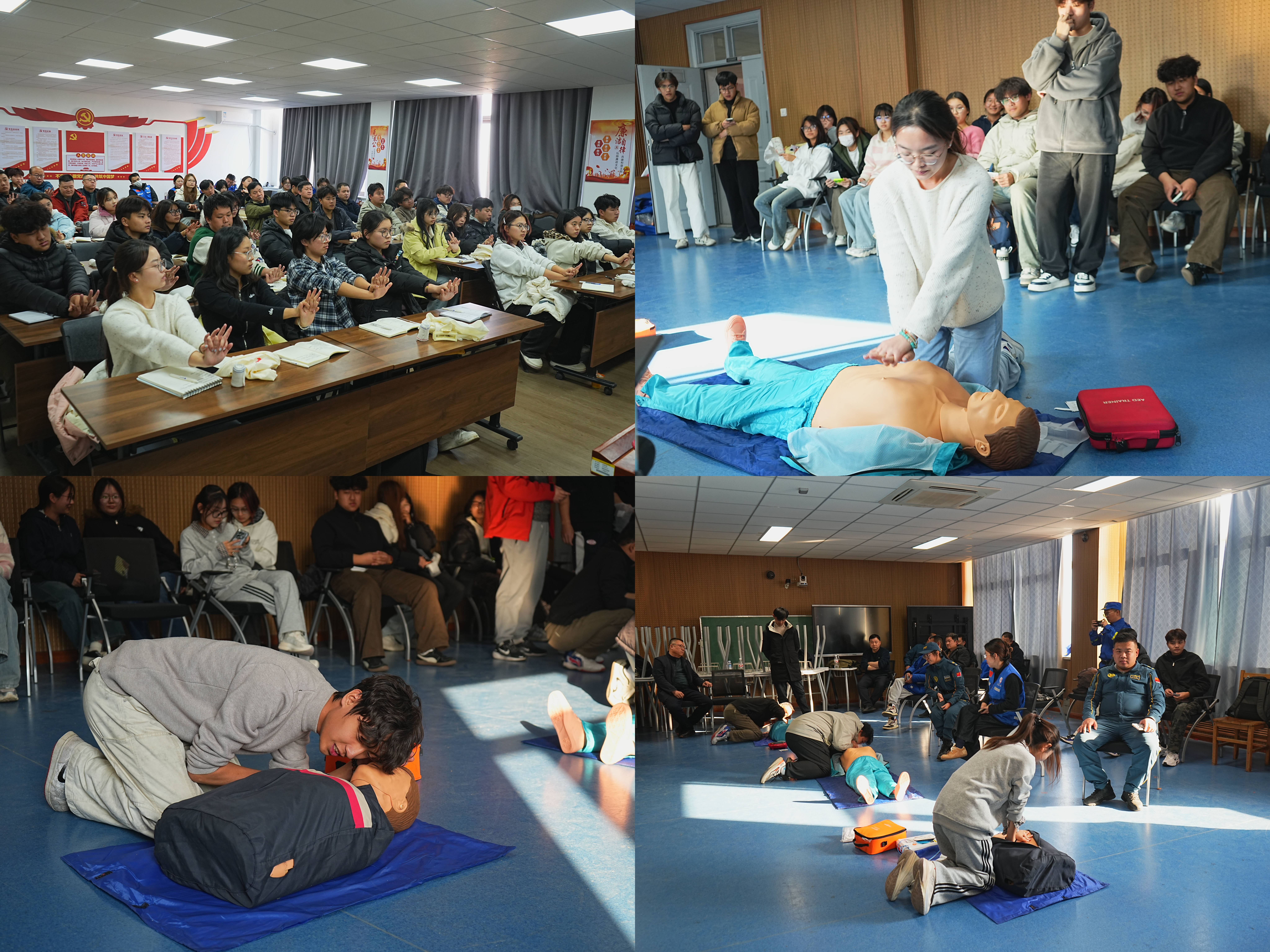 理论教学环节,蓝天救援队导师紧扣校园场景特点,以“真实案例剖析+互动答疑解惑”为核心展开授课。针对大学生日常活动中易发生的运动损伤、气道异物梗阻、突发晕厥等情况,系统讲解心肺复苏(CPR)、自动体外除颤器(AED)操作原理,以及止血包扎、烧烫伤应急处理等关键知识,引导学员建立“安全优先、科学施救、快速响应”的应急思维,为实操训练筑牢理论根基。
