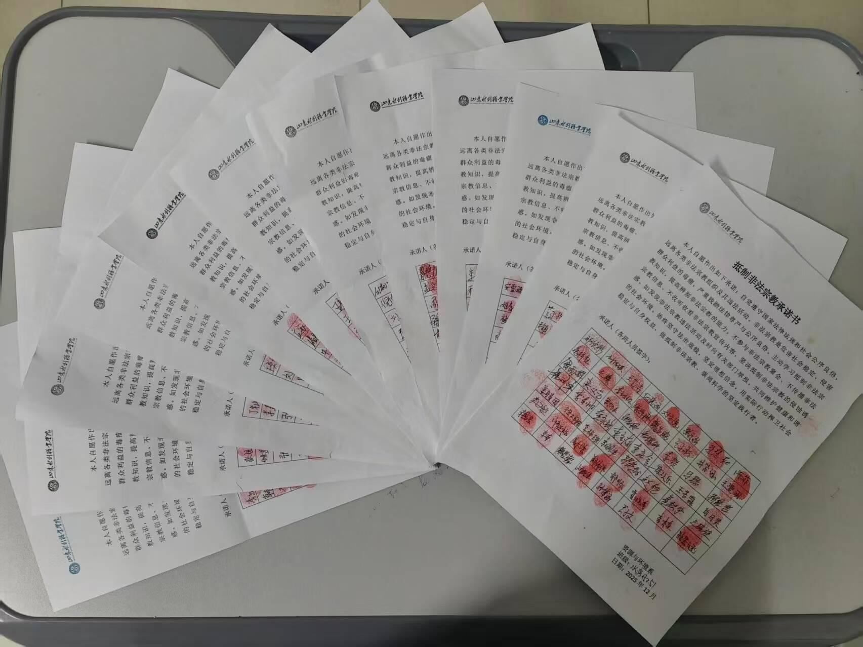 组织全体学生举行抵制非法宗教承诺书签署仪式。同学们积极响应号召,郑重签下姓名,以庄严承诺表达自觉抵制非法宗教侵蚀、守护校园和谐稳定的坚定决心。此次活动不仅是一次仪式化教育,更是一场深刻的思想淬炼,有效引导学生将抵制非法宗教的外在要求内化为坚定信念和自觉行动,为构建平安校园、和谐校园凝聚起强大育人合力。