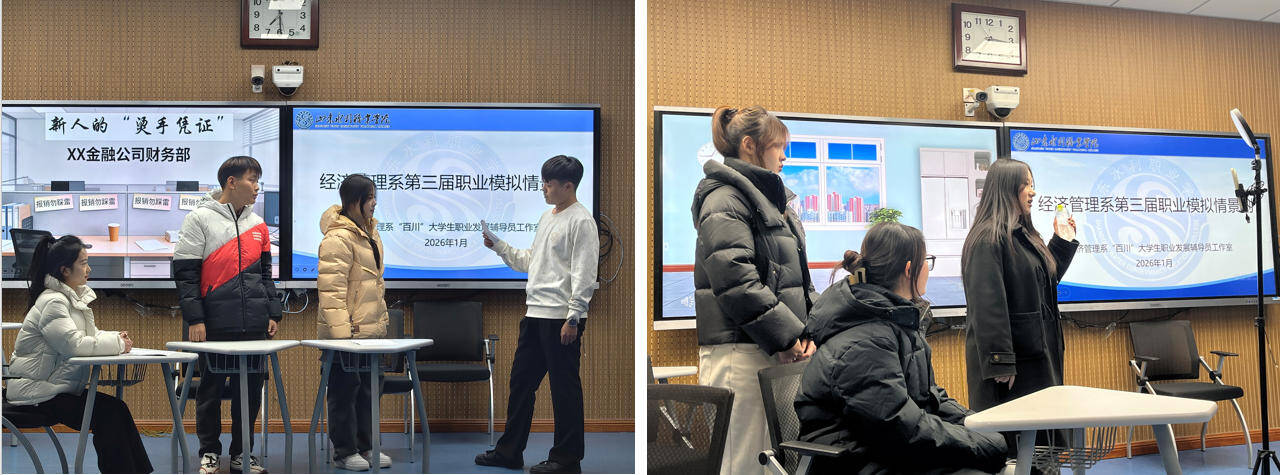 为助力学生提前感知职场氛围、锤炼综合职业素养,推动理论认知向实践能力转化,1月7日晚,经济管理系第三届职业模拟情景剧精彩上演。本次活动由经济管理系、“百川”大学生职业发展辅导员工作室主办,经过前期选拔,共有6支队伍晋级决赛。各班级学生代表组成大众评审团,共同见证了一场生动的职场模拟展示。
