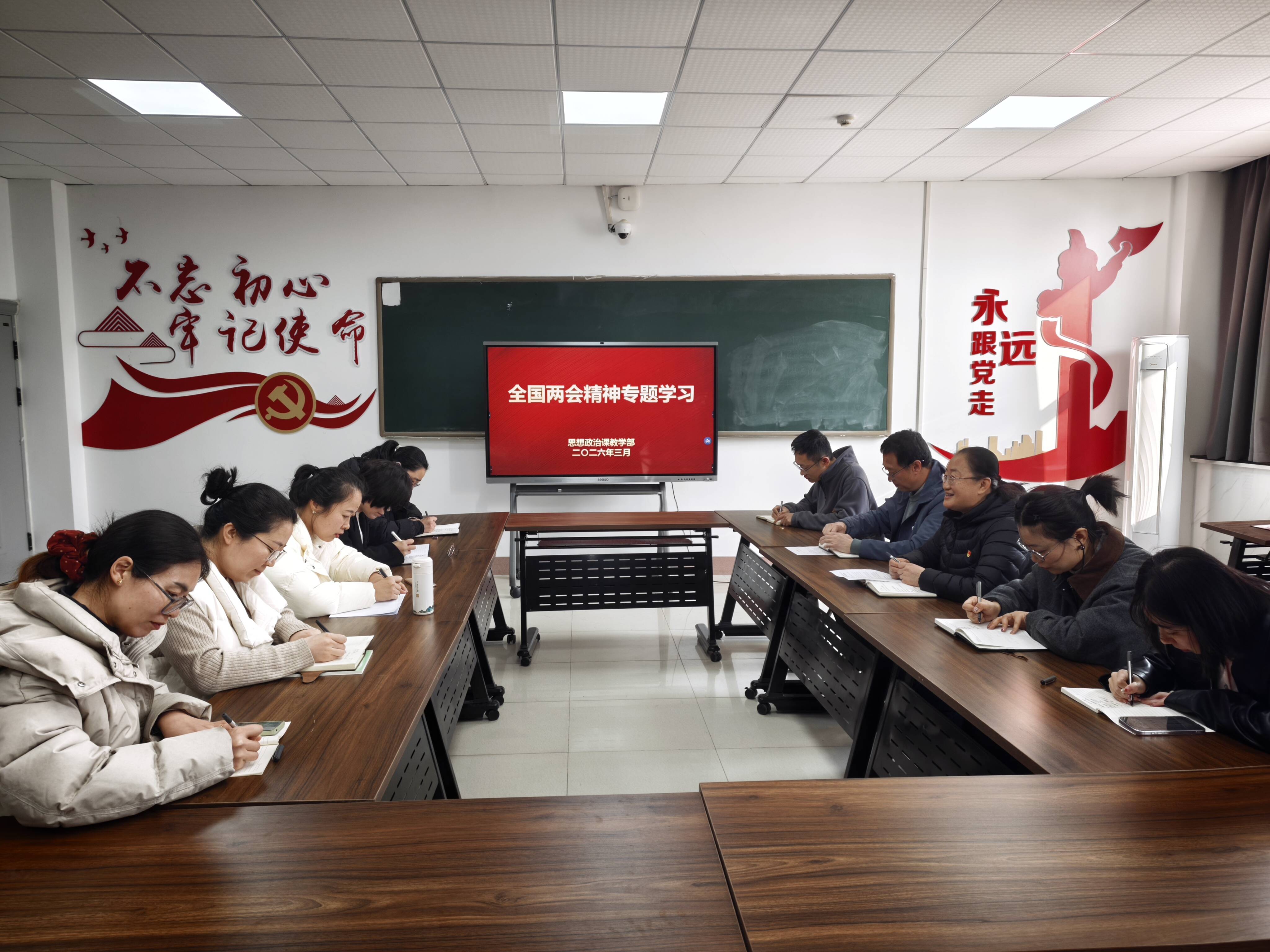 为深入学习贯彻2026年全国两会精神,推动党的创新理论全面、生动融入思想政治理论课教学,切实提升思政课的思想性、针对性与吸引力,3月19日,思想政治课教学部组织全体教师专题学习全国两会精神,共谋思政育人新路径。