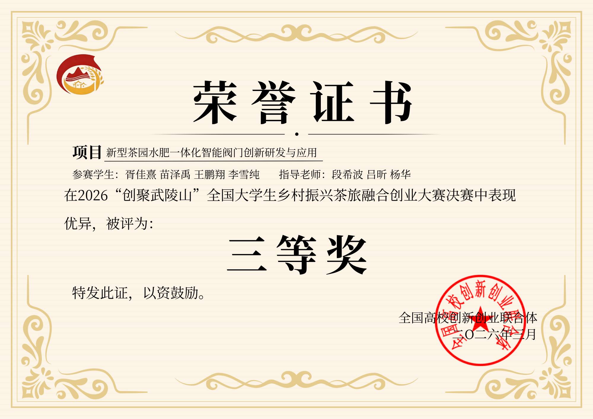 近日,由全国高校创新创业联合体主办的“创聚武陵山”全国大学生乡村振兴茶旅融合创业大赛总决赛在湖南省保靖县举行。学院参赛项目《新型茶园水肥一体化智能阀门创新研发与应用》凭借扎实的研究基础和突出的实践应用价值,荣获三等奖。
