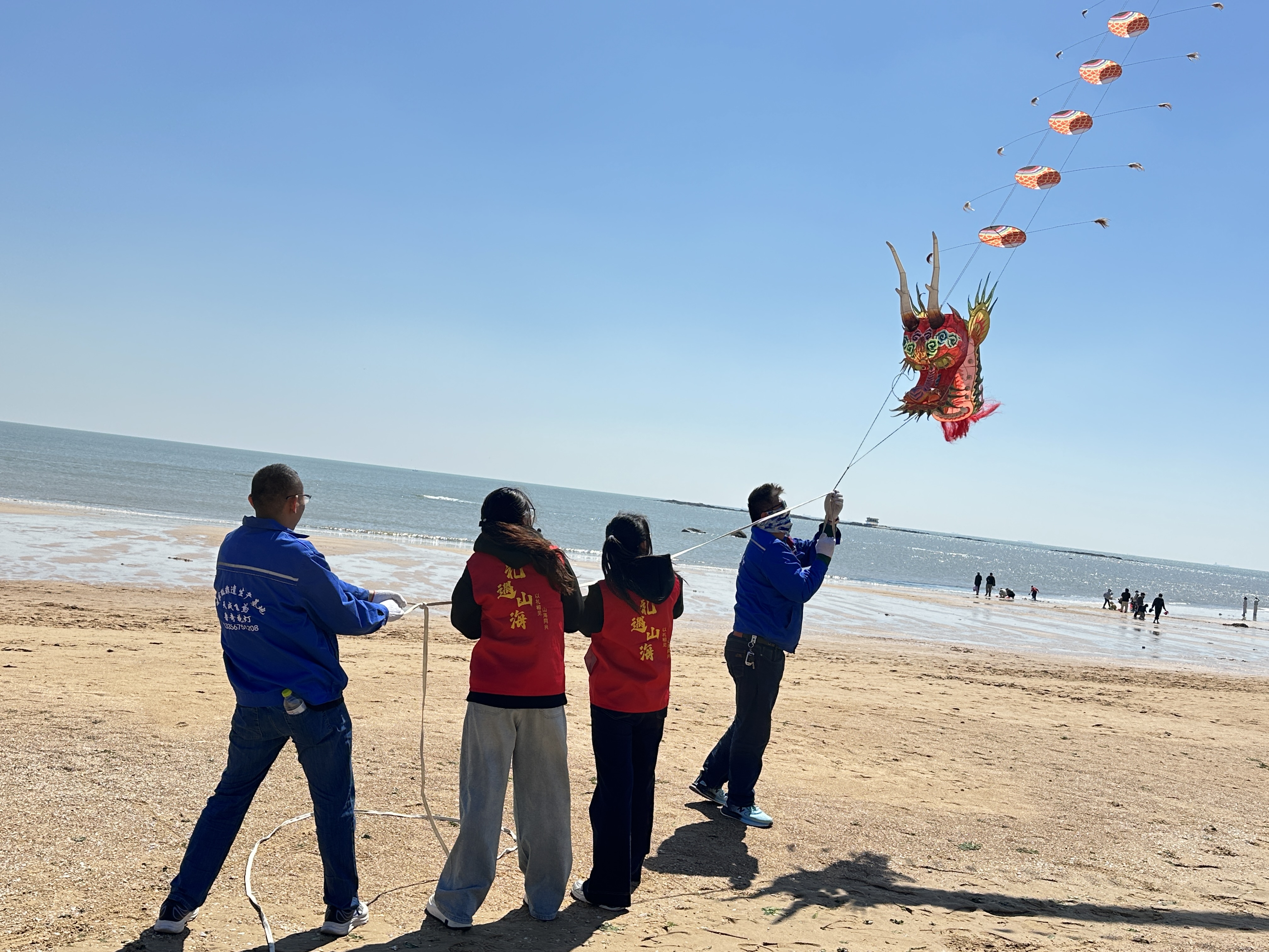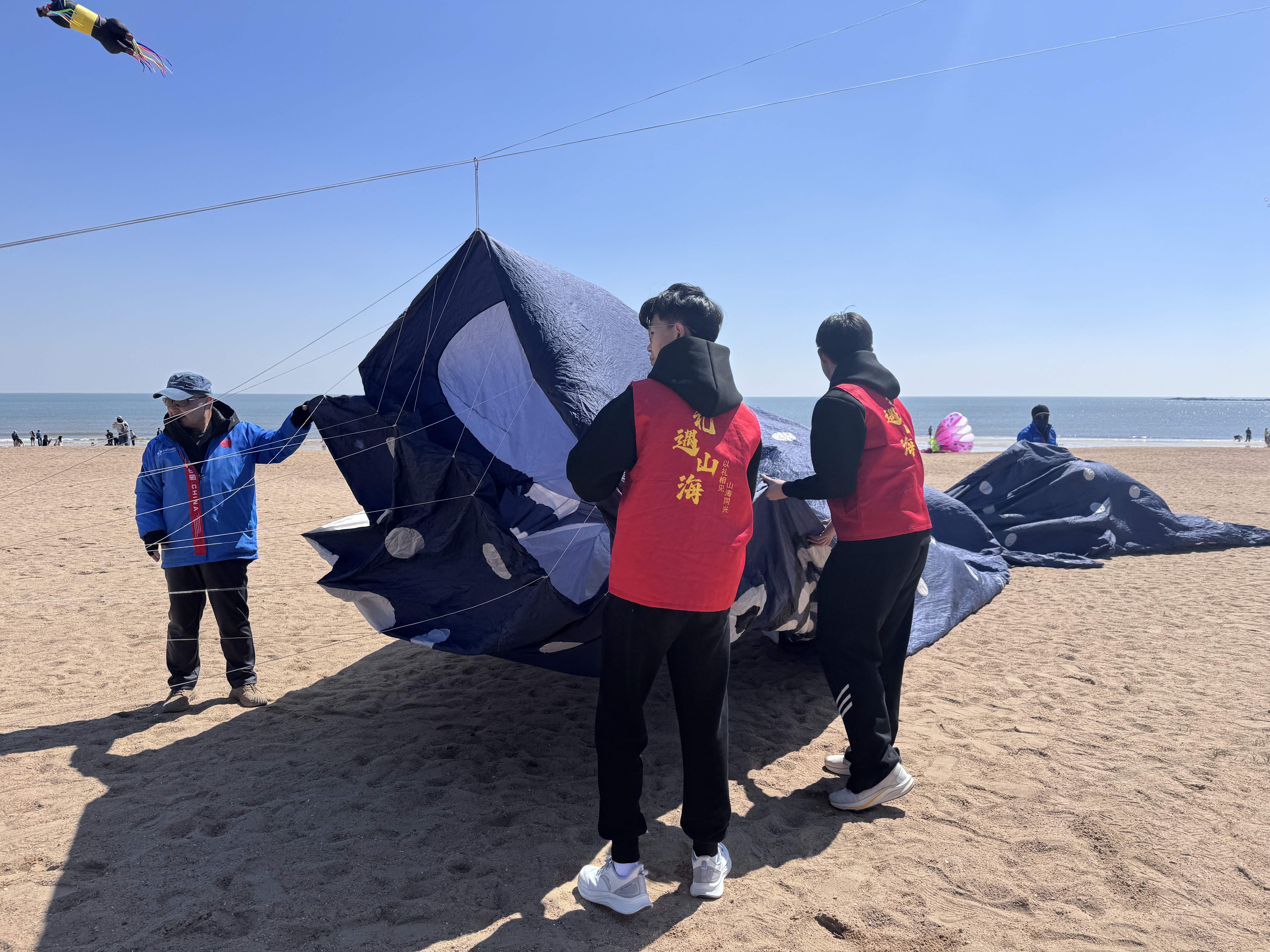 活动当天,志愿者们提前接受专业培训,在巨型风筝放飞区承担起风筝线组整理、地面牵引配合、安全区域引导等关键任务。当百米长的风筝在众人协作下腾空舒展,与碧海金沙相映成趣时,志愿者们精准的配合操作确保了这场视觉奇观的完美呈现。