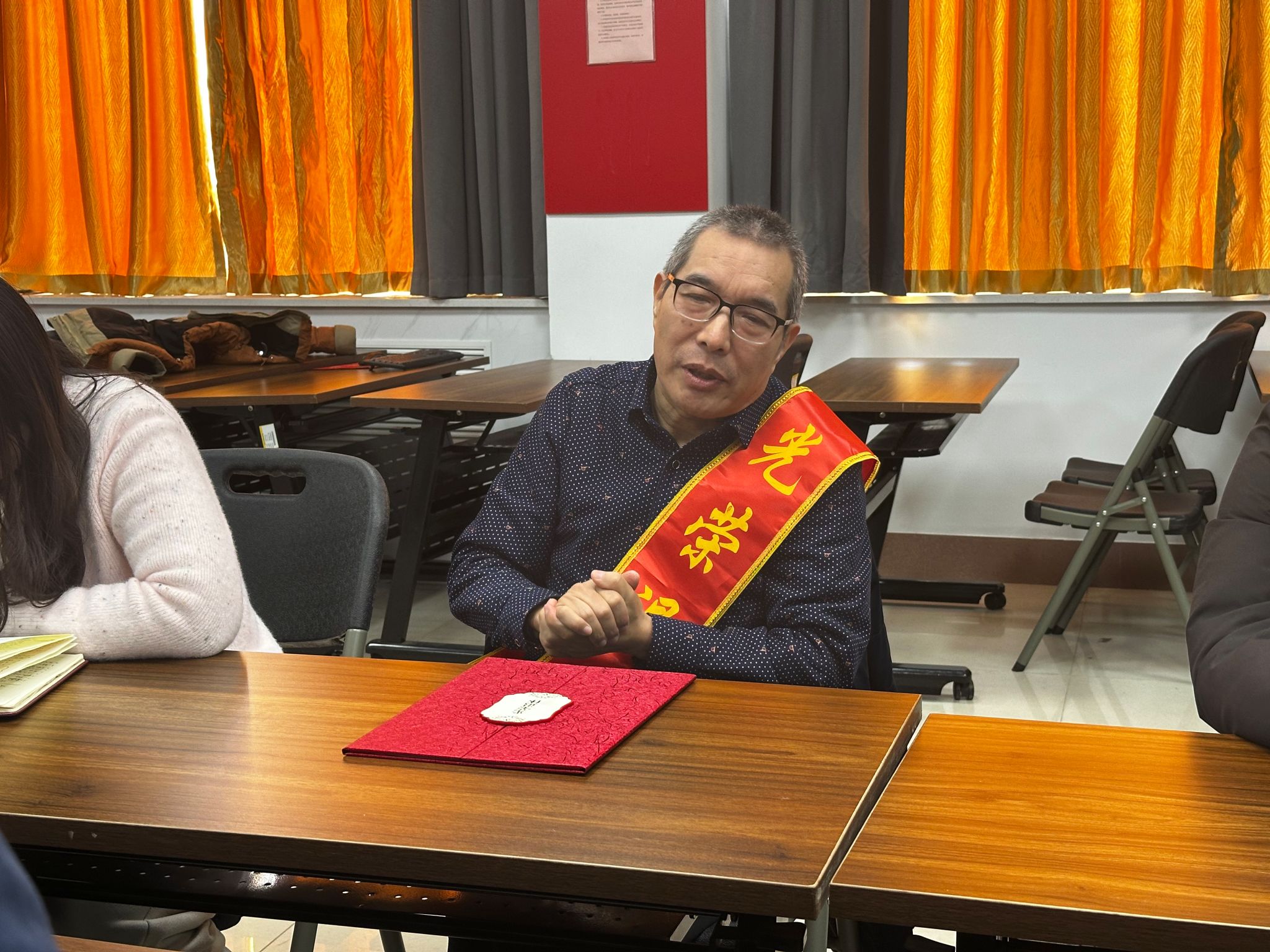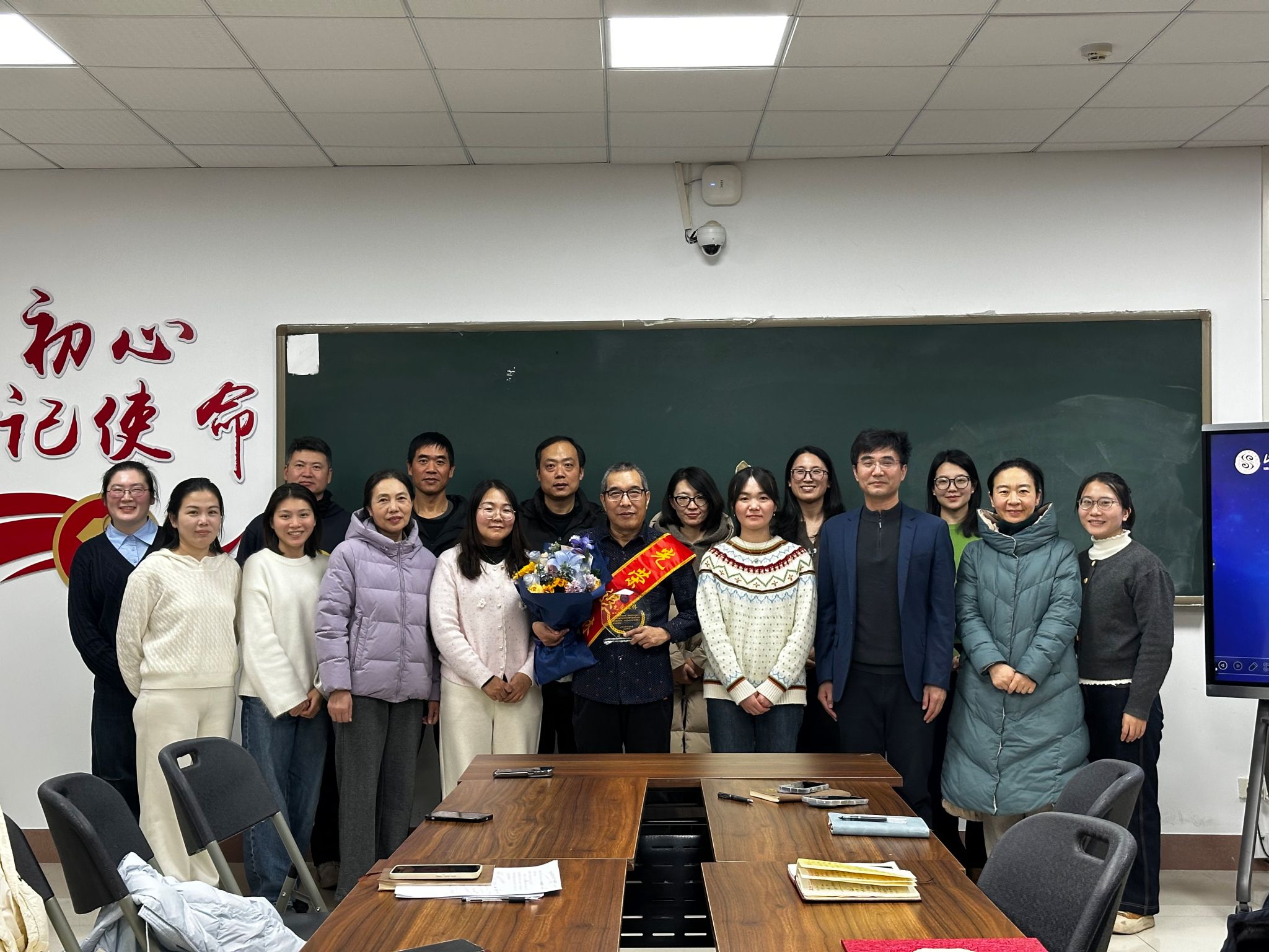 仪式上,沙登阁为张现华老师佩戴荣退绶带并颁发荣誉证书,对张老师数十载的辛勤耕耘与默默奉献致以衷心感谢和崇高敬意。语文教研室教师代表向张老师敬献鲜花与纪念品,表达全体同仁的诚挚祝福。全体与会人员与张老师合影留念,现场气氛真挚感人。