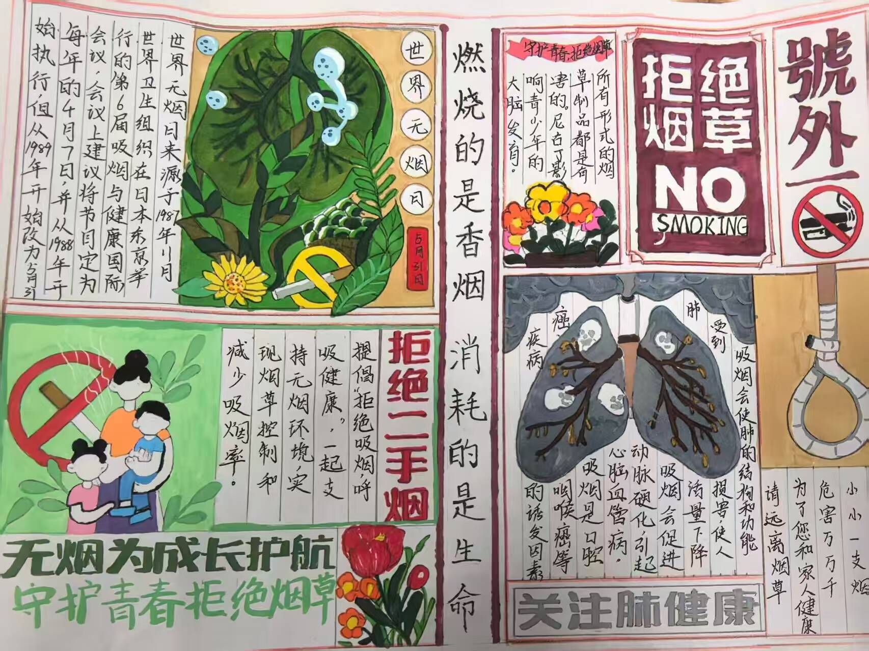 手抄报展戒烟决心。各班学生积极参与禁烟手抄报制作,通过文字、漫画等创意形式,展现对无烟生活的向往与支持。制作过程中,同学们相互交流想法,分享自己身边的吸烟现象与禁烟感悟,在协作创作中进一步深化了对 “守护身边人” 的理解。同时,优秀作品将作为校园禁烟宣传素材。