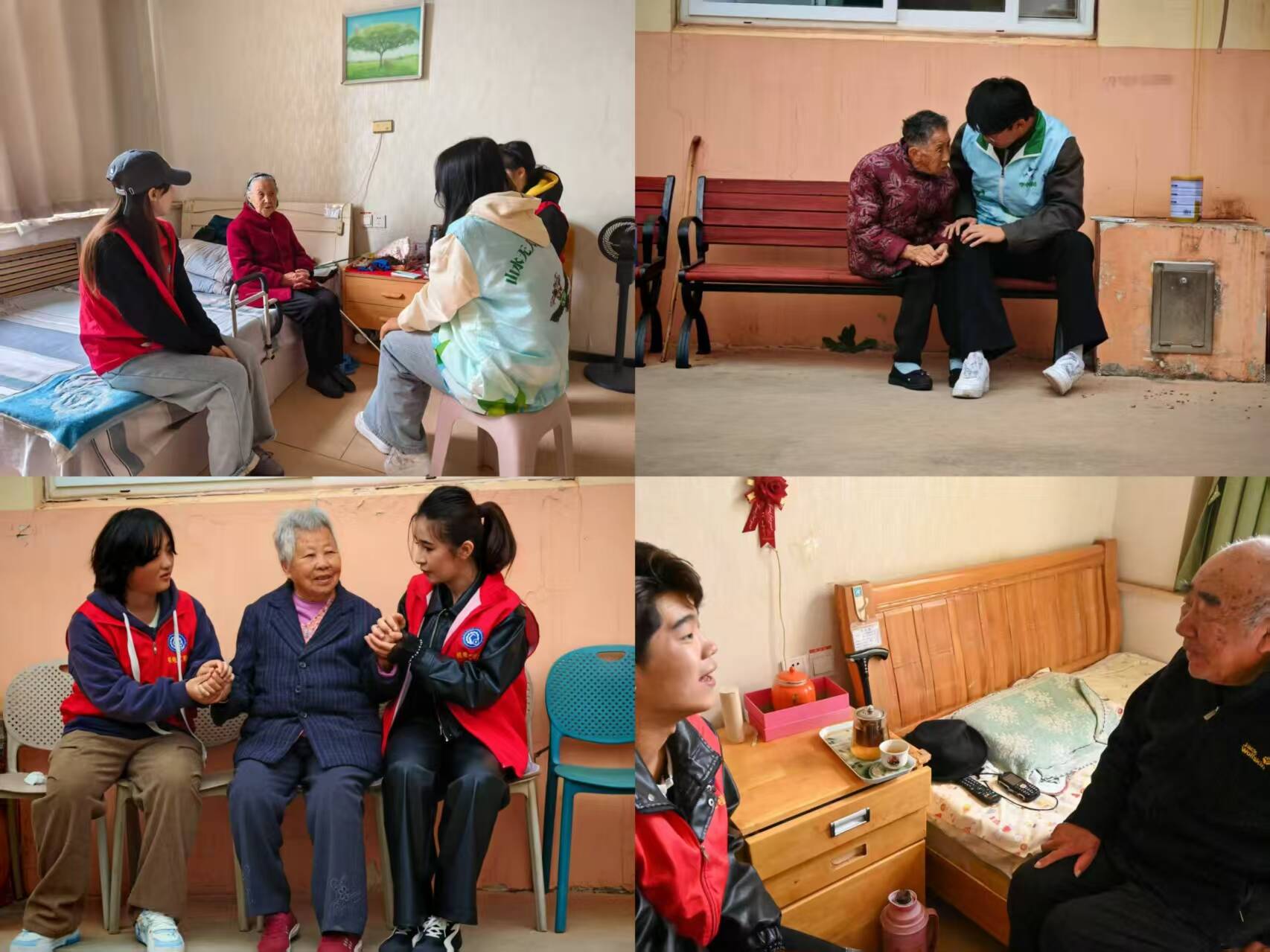 才艺展示结束后,学子们分成若干小组,走进老人们的房间,与长辈们促膝长谈。学子们像对待自家亲人一般,耐心倾听老人们讲述过去的故事、生活的点滴。他们关切地询问老人的身体状况、饮食起居,叮嘱老人注意保暖和健康,并用年轻人的视角分享校园趣事、社会新鲜事,为老人们的生活注入新的活力。