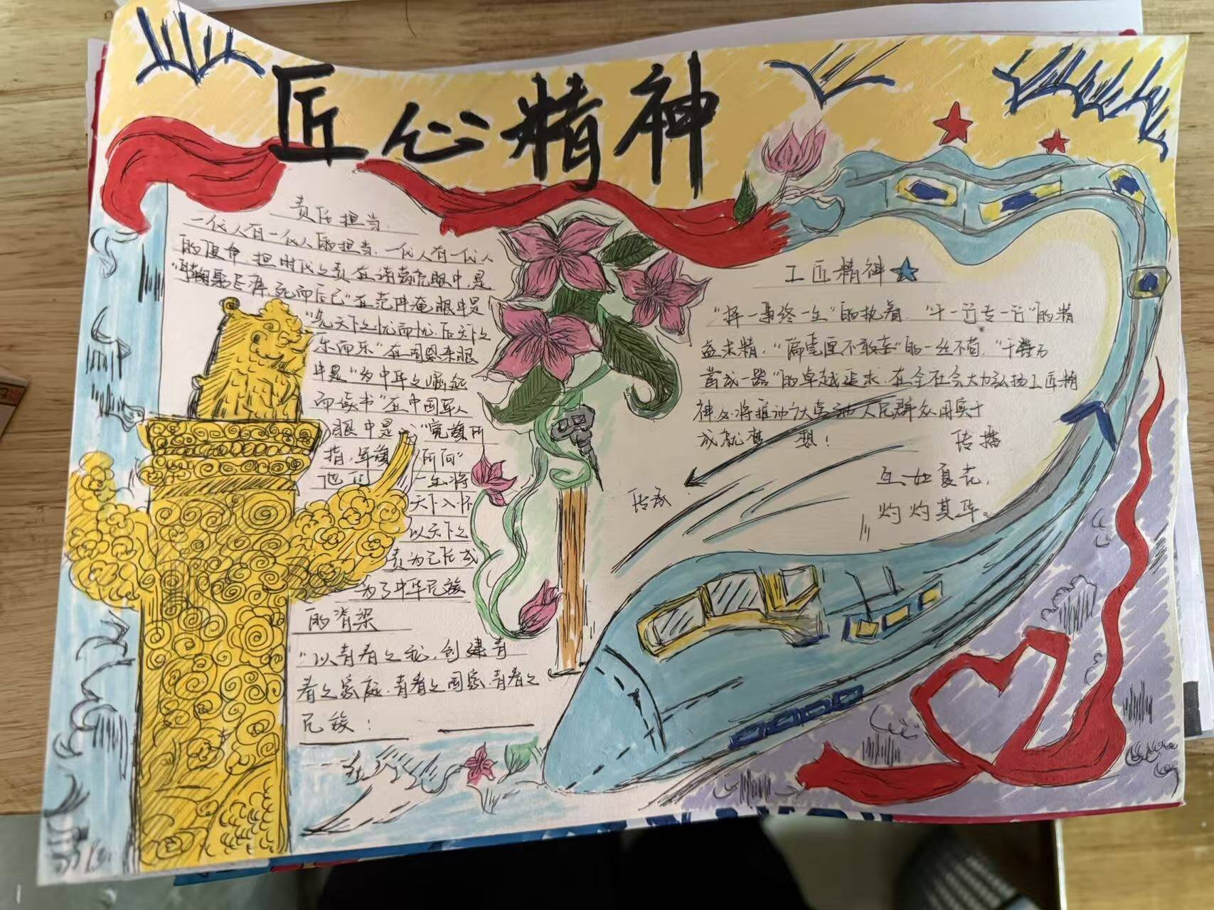 活动尾声,一份份主题鲜明的手抄报新鲜出炉,为活动画上完美句号!同学们以笔为刃、以纸为媒,用多彩的画笔、精炼的文字,将对班级的热爱、对工匠精神的理解融入作品之中。