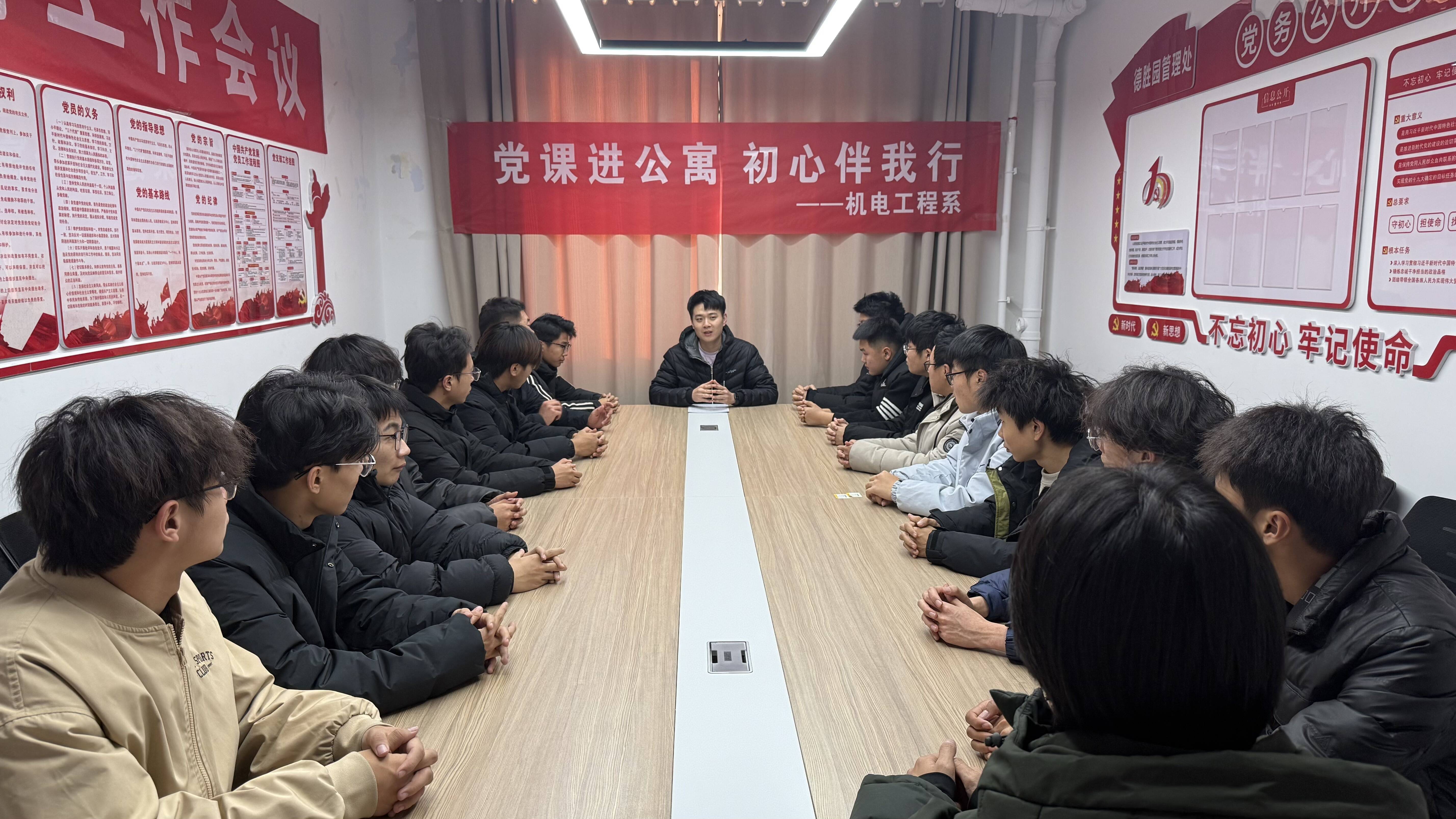 开展“党课进公寓,初心伴我行”主题活动,创新打造公寓“移动课堂”。党员教师深入学生社区,解读党的二十届四中全会精神,引导学生将个人理想融入国家发展,在青春赛道上践行初心使命、勇担时代责任。