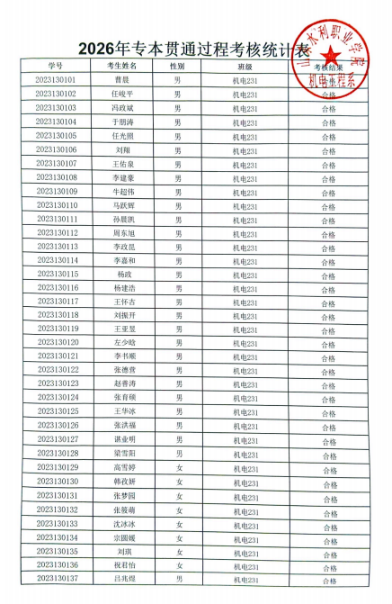 根据《山东省职业院校与本科高校对口贯通分段培养转段工作实施方案》(鲁教学发〔20153号)和《关于做好2026年职业院校与本科高校对口贯通分段培养转段工作的通知》(鲁教学函〔202522号)等文件精神,对我校机电一体化技术专业2026年“3+2”对口贯通分段培养班级学生过程考核合格名单予以公示,公示期7天,如有异议,请反馈2327办公室。名单如下:
