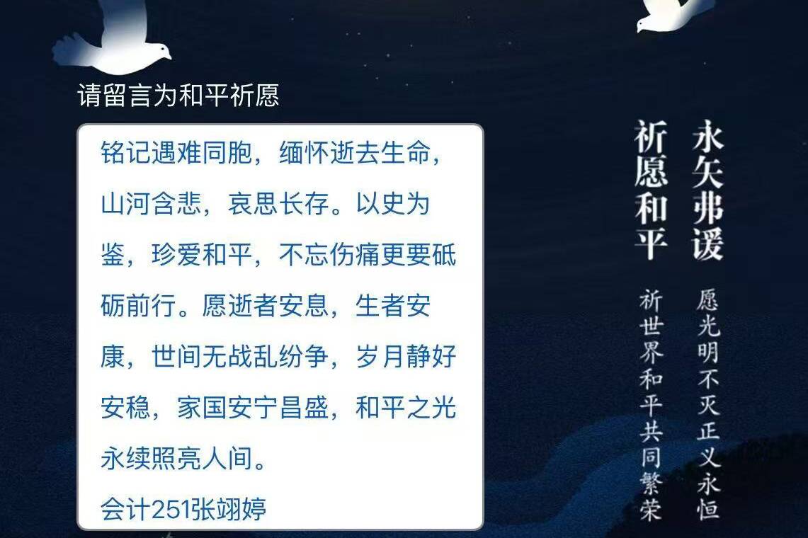 线上公祭缅怀活动同步举行。各班级组织开展“和平祈愿·经管担当”线上祭奠,深切缅怀南京大屠杀死难同胞,和平祈愿更是展现了学子们的时代责任感与担当意识。