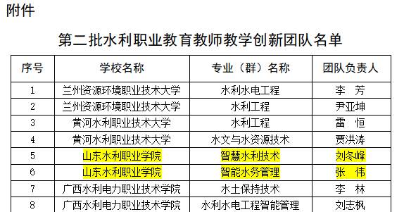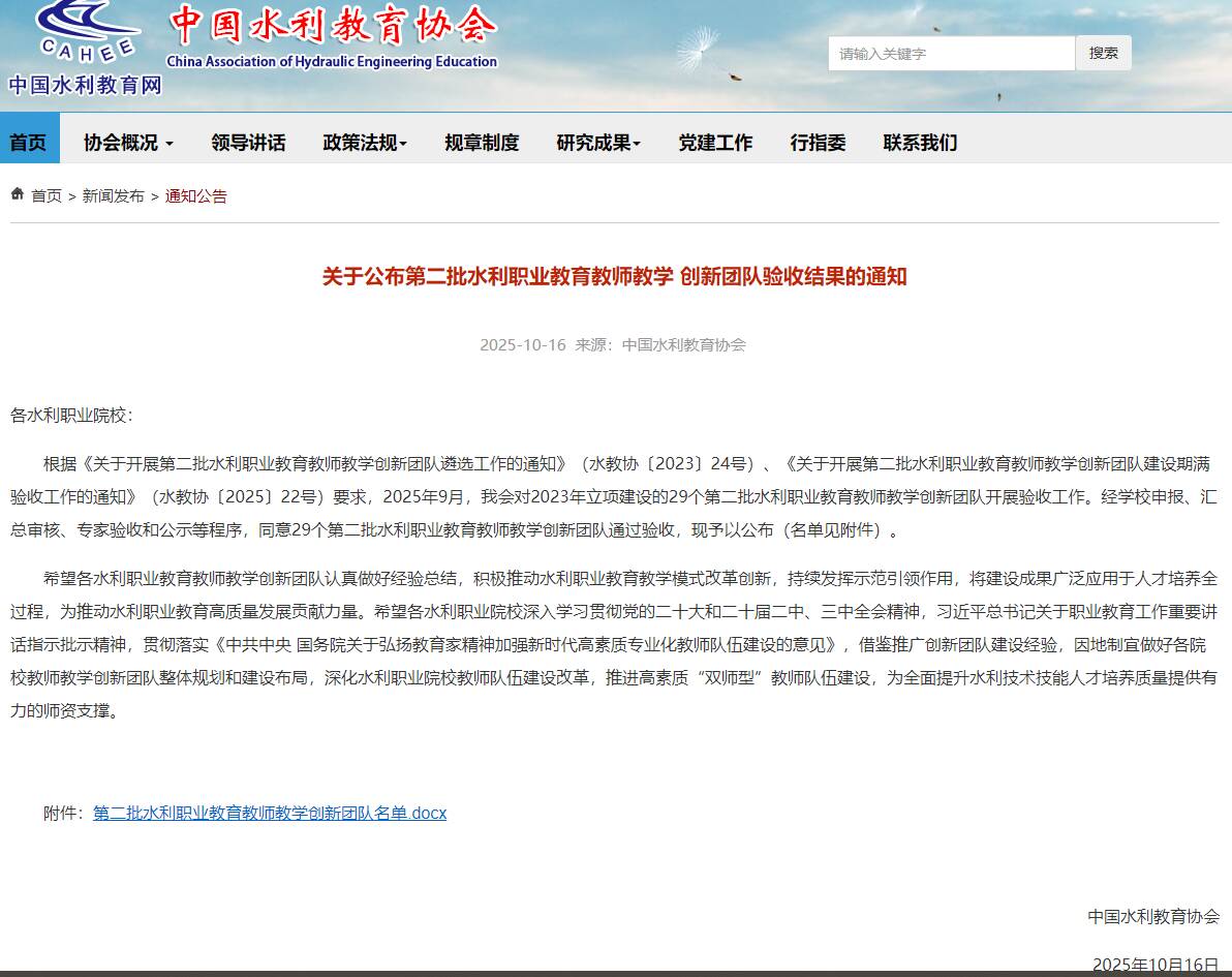 近日,中国水利教育协会发布了《关于公布第二批水利职业教育教师教学创新团队验收结果的通知》,学院智慧水利技术与智能水务管理两支团队凭借扎实的建设基础、鲜明的创新特色和显著的育人成效,顺利通过验收。