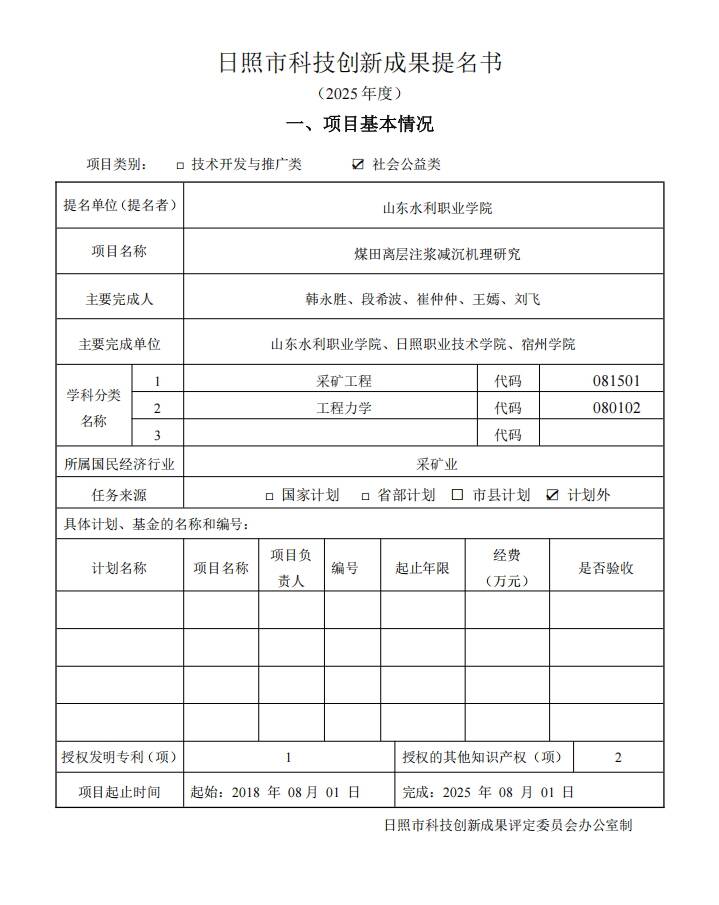 根据《日照市科技创新成果评定办法》(日政发〔2022〕11号)文件要求,经部门推荐、学院审核,拟推送项目《煤田离层注浆减沉机理研究》参加2025年度日照市科技创新成果提名工作,现予以公示。 项目名称:煤田离层注浆减沉机理研究 公 示 期:2025年11月21日至11月27日 接访地点:行政楼1503办公室 接访电话:0633-7983936 如有异议,请以书面形式向教务与科研处反映(不受理口头、电话或匿名信形式反映的意见)。 教务与科研处 2025年11月21日