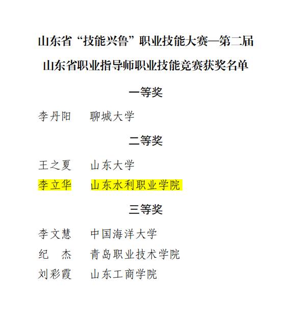 9月24日,由山东省人力资源和社会保障厅主办,山东省公共就业和人才服务中心、日照市人力资源和社会保障局共同承办的山东省“技能兴鲁”职业技能大赛——第二届山东省职业指导师职业技能竞赛在日照圆满落幕。我院招生就业处李立华老师凭借出色表现,以院校职业指导组第三名的优异成绩荣获二等奖,同时被授予“山东省职业指导专家”聘书,学校荣获优秀组织单位奖,实现我校在该项高水平赛事中的新突破。