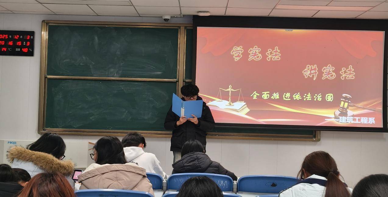 在全国“宪法宣传周”来临之际,建筑工程系紧紧围绕“学习宣传习近平法治思想,推动宪法深入人心”的主题,以“弘扬宪法精神,筑牢法治根基”为主线,精心策划并组织开展了形式多样的宪法宣传教育活动,推动宪法学习走进校园、深入社区,切实引导广大师生及群众增强法治观念,夯实法治校园建设基础。