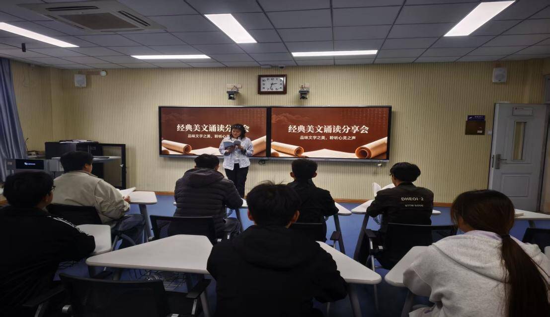 经典美文诵读分享会在海晏楼4209教室如期开展。各班级参与人员带着精心准备的文学读物和本班书法作品齐聚现场,开启了一场书香与墨韵交织的文化盛宴。分享会上,同学们或诵读经典片段,或畅谈阅读感悟,字正腔圆的朗读声中,满是对文学的热爱与敬意。