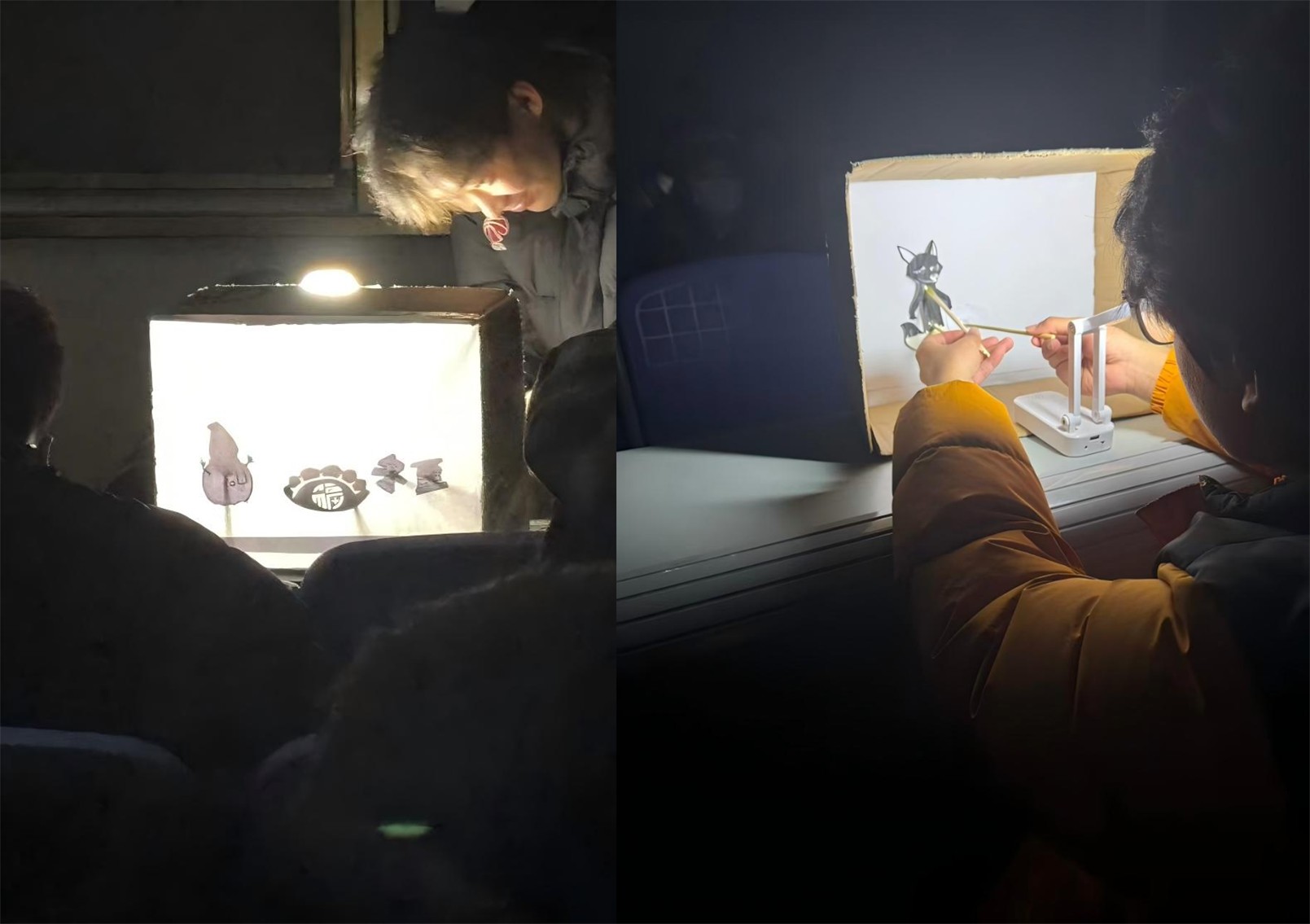 皮影逐光 趣绘冬日。同学们利用A4纸、彩笔、一次性筷子等材料,自主完成皮影制作。道具设计围绕冬日主题,打造出雪人、水饺、狐狸等造型可爱、色彩鲜明的皮影。表演环节,单人选手与多人团队分工协作,通过操控皮影演绎冬至传说、冬日趣味故事,既锻炼动手能力与团队协作力,也让大家在趣味体验中感受传统民间艺术的魅力。
