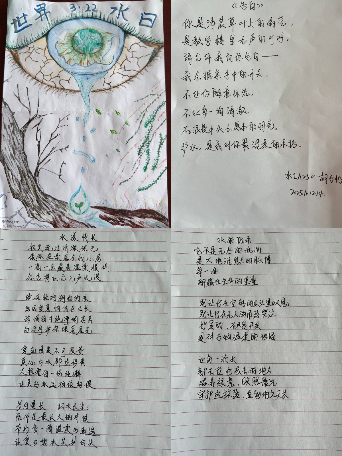 创意纷呈,绘就节水画卷。活动期间,发起节水主题海报作品征集,学生们积极响应、踊跃参与。学生通过充满想象力的构图和生动的色彩,描绘出对水资源短缺的忧思与对节约用水的倡导,用艺术创作真诚表达了对珍贵水资源的珍视与爱护。