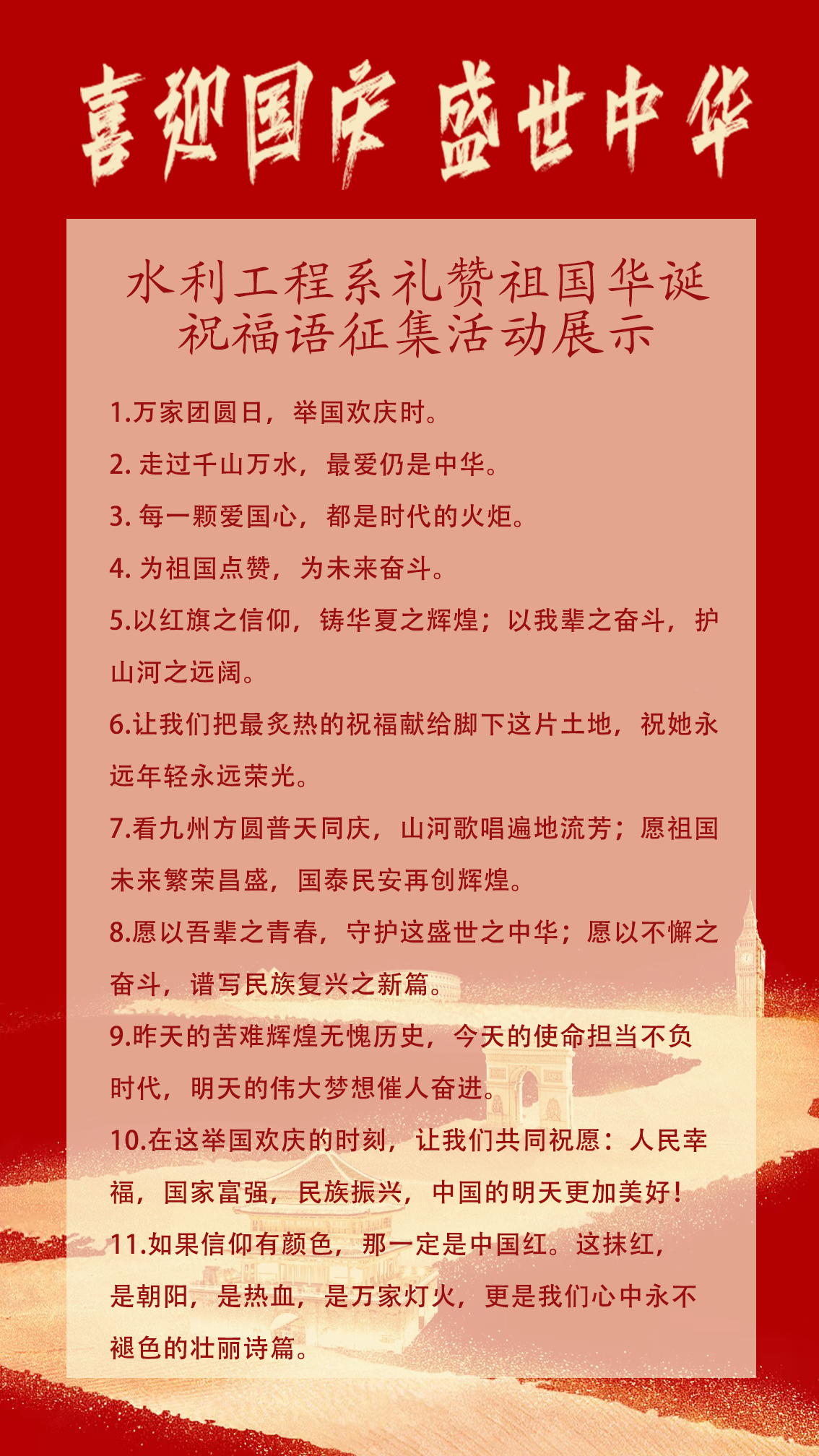 面向2025级新生发起“喜迎国庆,盛世中华”标语征集活动。活动一经推出,便受到了广泛关注,创作出了一批“七十六载治水兴邦润泽华夏,新时代水利青年再续华章”、“以青春之我,筑水利之基,护盛世山河安澜”等既贴合专业特色又充满爱国激情的优秀作品。