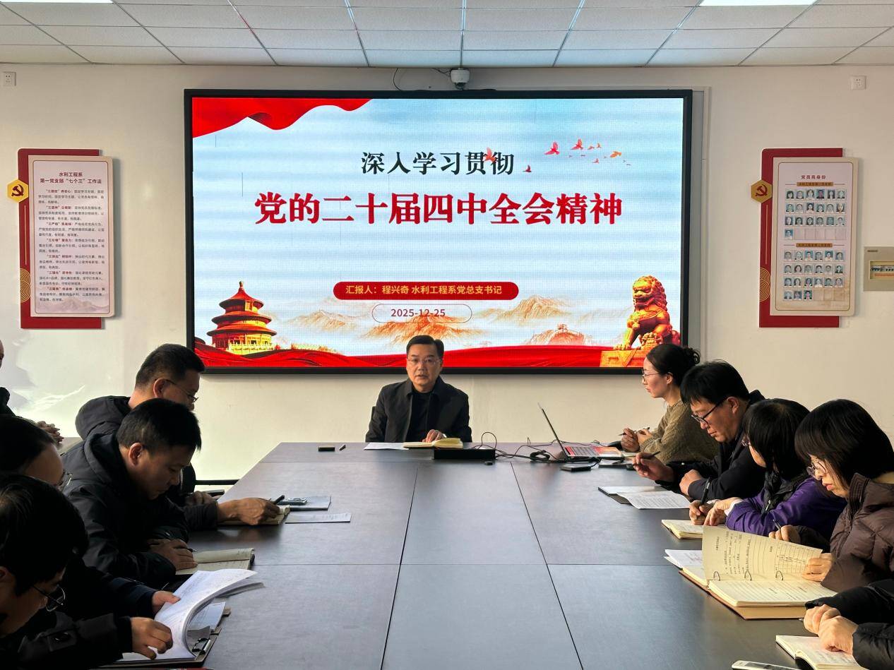 为深入学习贯彻党的二十届四中全会精神,切实把全体党员干部的思想和行动统一到全会决策部署上来,2025年12月25日,水利工程系党总支书记程兴奇以“深入学习贯彻党的二十届四中全会精神”为题讲授专题党课,系全体党员教师参加学习。